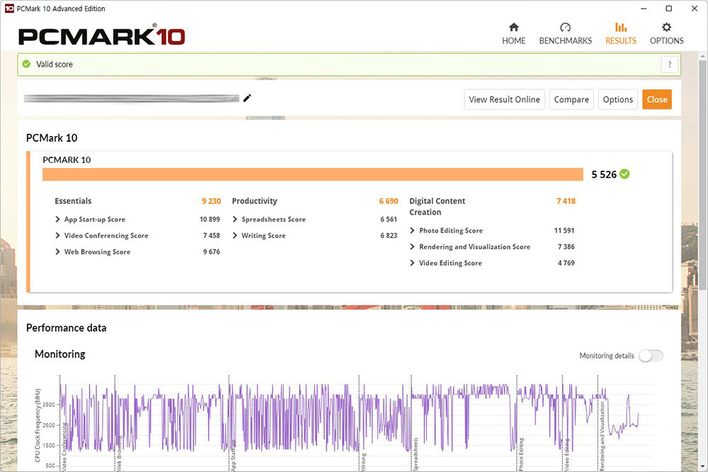 마지막으로 노트북의 전체적인 성능을 평가해주는 PCMARK10의 점수는 5526점으로 측정되었습니다. 12세대 인텔® 코어™ i7 프로세서는 상당히 뛰어난 성능을 제공해준다고 판단되었습니다.