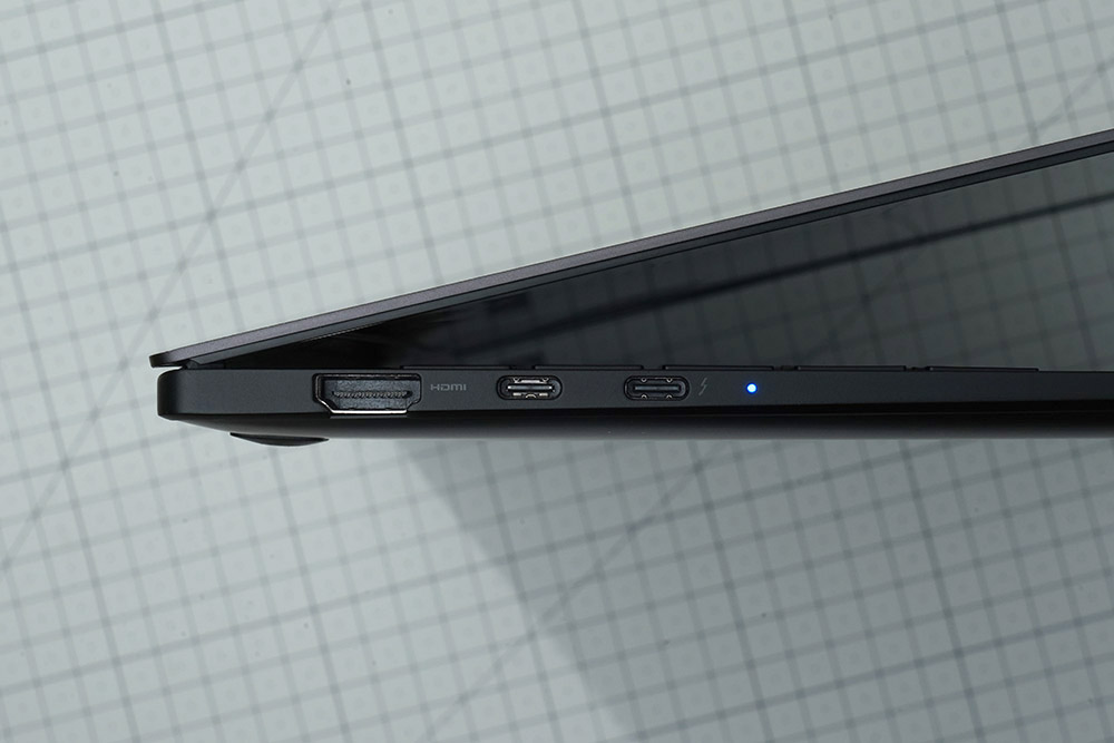 삼성전자 갤럭시북2 프로의 입출력 단자를 살펴보면 왼쪽에는 HDMI와 USB-C 그리고 단 하나의 케이블로 4K 모니터를 연결하고 파일 전송 및 노트북을 충전시켜 줄 수 있는 썬더볼트™4 인터페이스가 배치되어 있습니다.