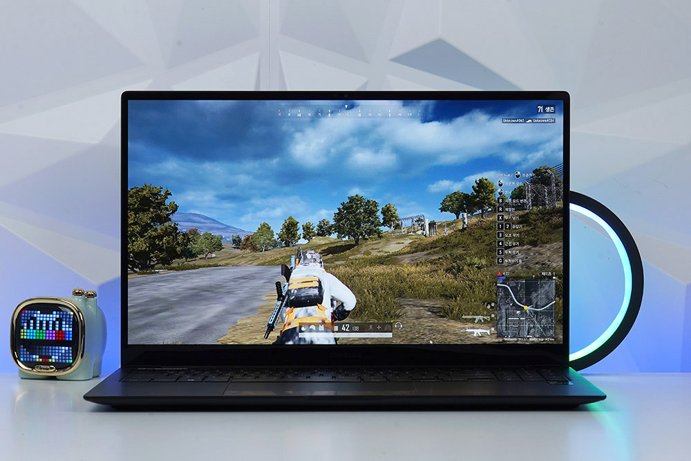 삼성전자 갤럭시북2 프로의 게임 성능을 살펴보면 리그 오브 레전드는 FHD 해상도와 그래픽 보통에서 평균 150프레임이 측정되었고 배틀그라운드는 FHD 해상도와 전반적인 그래픽 품질 매우 낮음에서 평균 83프레임(하위 1% 27프레임)이 측정되었습니다.