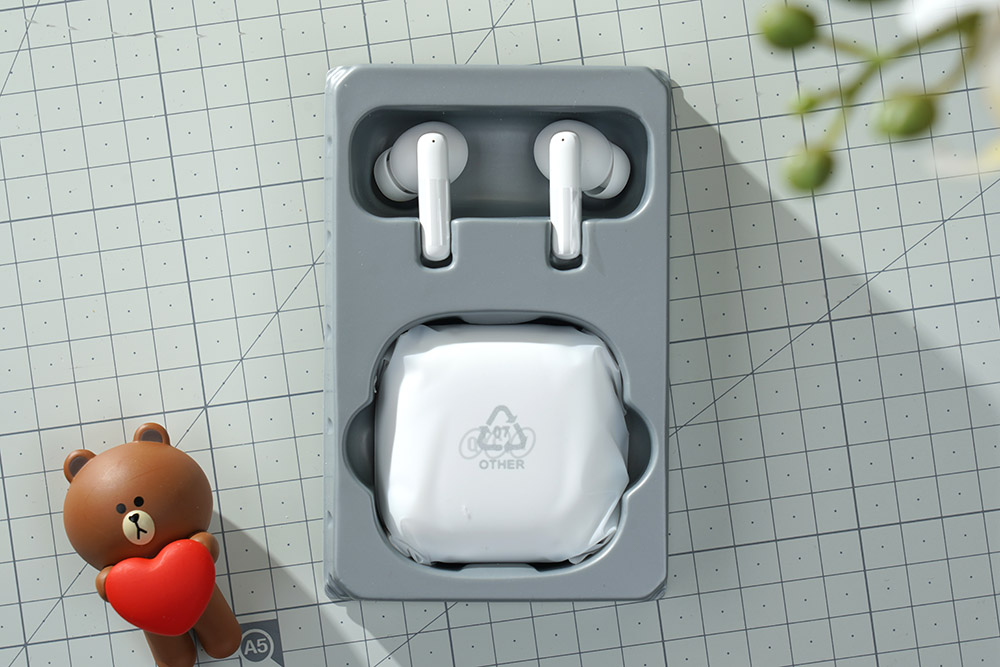 QCY T13 ANC 블루투스 이어폰의 내부를 확인해 보면 플라스틱으로 제작된 완충재에 이어폰과 충전 케이스가 포함된 것을 확인할 수 있습니다. 그리고 이어폰의 다리 부분에는 보호 비닐이 부착되어 있으니 충전할 때는 제거를 해야 합니다.