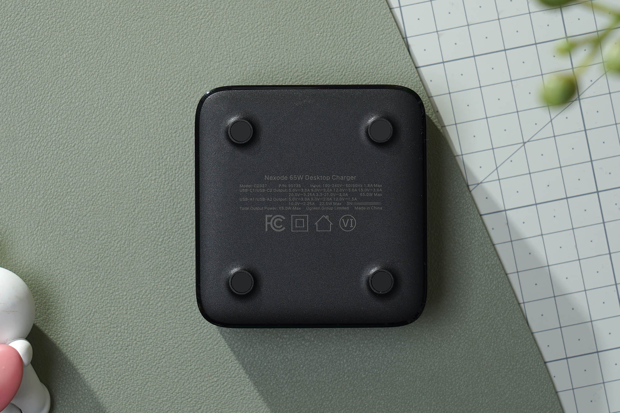 바닥을 살펴보면 모서리 부분에 고무 지지대가 배치되어 있고 중앙에는 Nexode 65W Desktop Charger라는 문구와 함께 CD327의 모델 넘버 그리고 입출력 규격이 설명되어 있습니다.