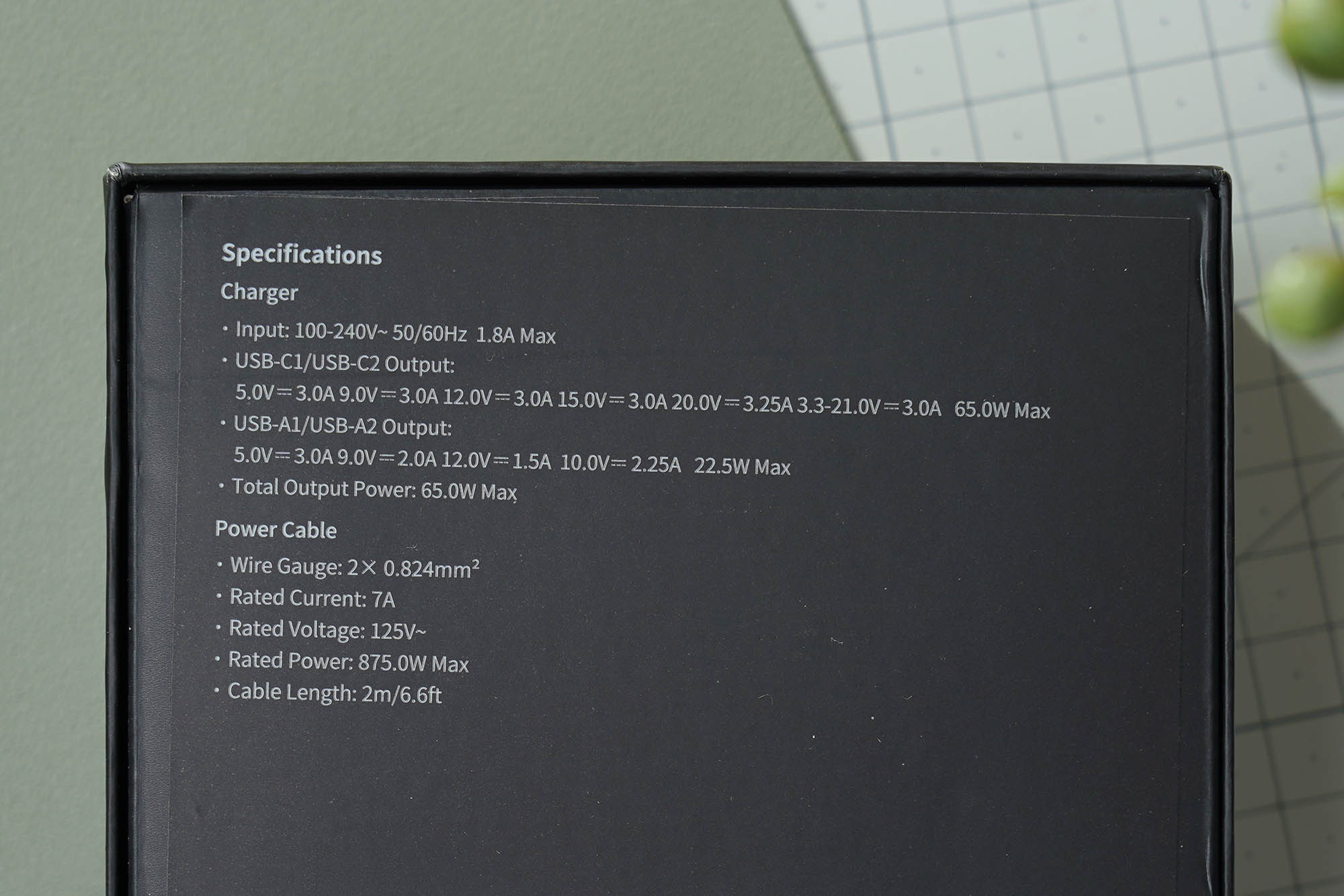 유그린(UGREEN) 65W GaN 충전기의 스펙을 살펴보면 입력은 100-240V 50/60Hz 프리볼트 입력을 지원하고 출력은 USB-C1, C2는 최대 65W UAB-A1, A2는 22.5W를 지원합니다.