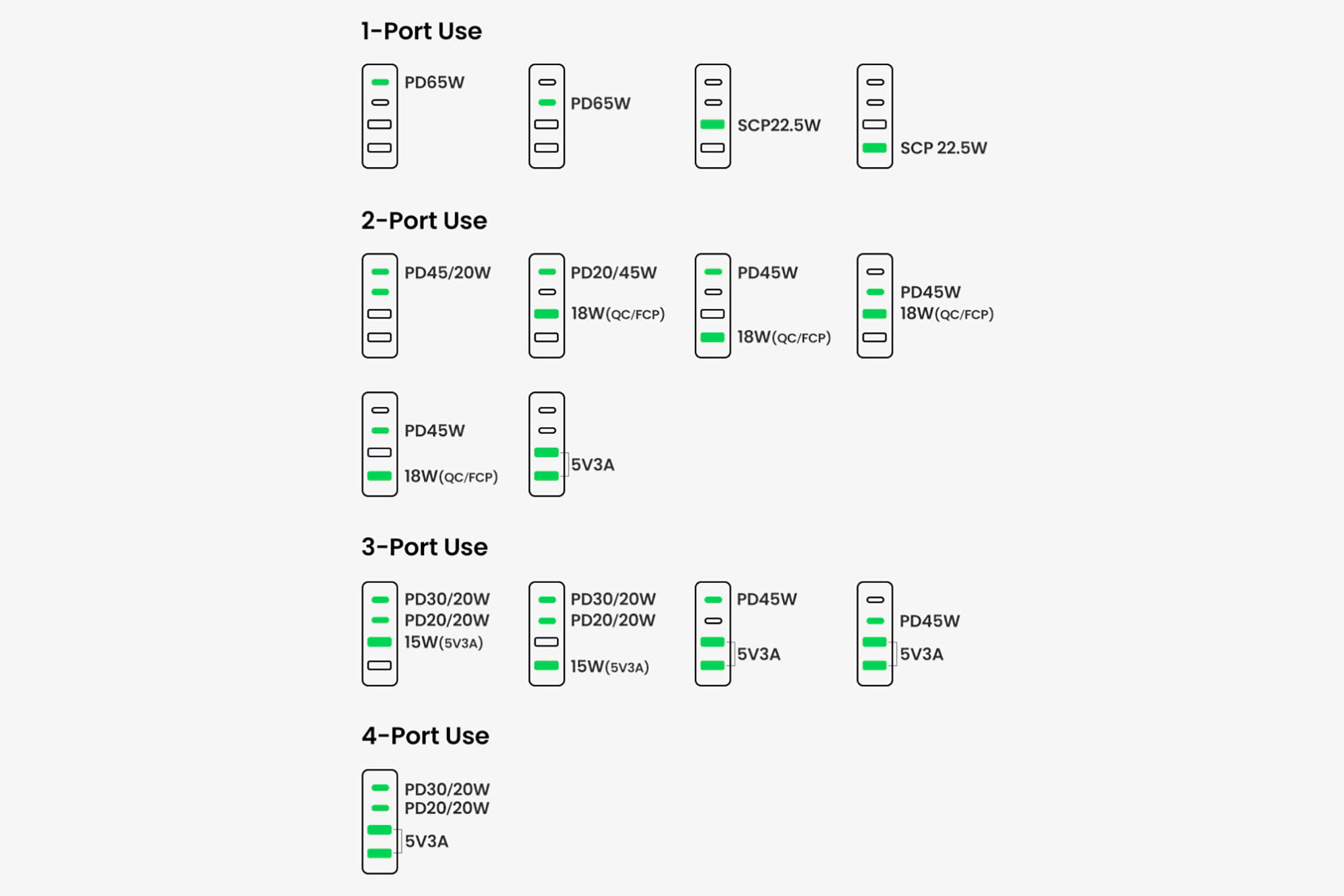 유그린(UGREEN) 65W GaN 충전기의 구성품을 살펴보면 유저 매뉴얼이 한 장 포함되어 있습니다. 포트의 연결 상태에 따른 출력이 설명되어 있으니 한 번 정도 자세하게 읽어 보는 것이 좋을 것 같습니다.