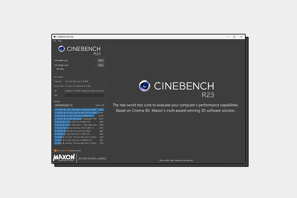 지금까지 씨네벤치 R23의 다운로드와 사용법을 자세하게 확인해 보았습니다. 다른 벤치마크 프로그램과는 다르게 전체적으로 단순한 느낌을 주는 편이고 결과 자체의 점수도 랭킹이 정확하게 표시되기 때문에 현재 성능 상태 자세하게 파악할 수 있습니다. 그리고 데스크톱 PC나 노트북 CPU의 성능을 평가하고 싶거나 오버클럭킹을 하려는 분들은 한 번 활용해 보시길 바랍니다.