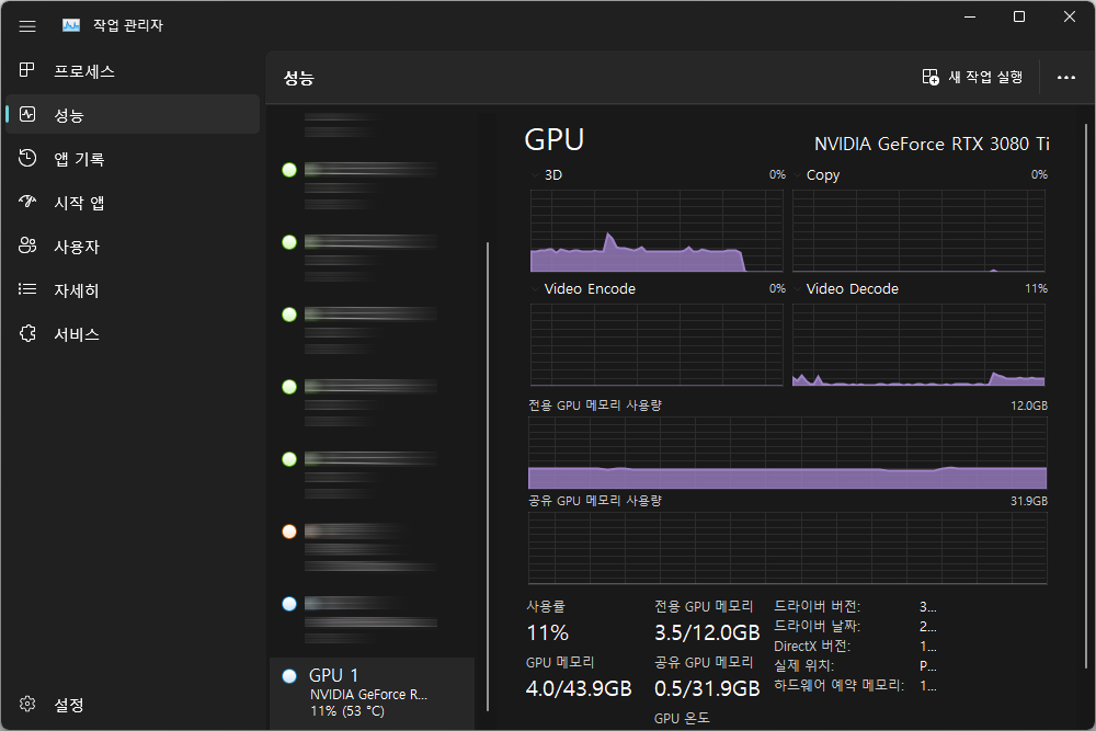 실제로 설정이 완료된 상태에서 그래픽카드의 사용량을 확인해 보면 유튜브를 시청할 때는 약 27% 정도를 유지했고 팟플레이어를 사용할 때는 약 11% 정도를 사용했습니다.