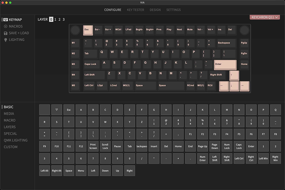 키크론 Q12 스플릿 기계식 키보드의 또 다른 장점은 QMK/VIA 프로그램을 지원한다는 점입니다. 최신 커스텀 키보드의 기본 기능 중의 하나라고 할 수 있고 자신의 필요에 따라서 단축키나 매크로 그리고 백라이트 효과 등을 조절할 수 있습니다.
