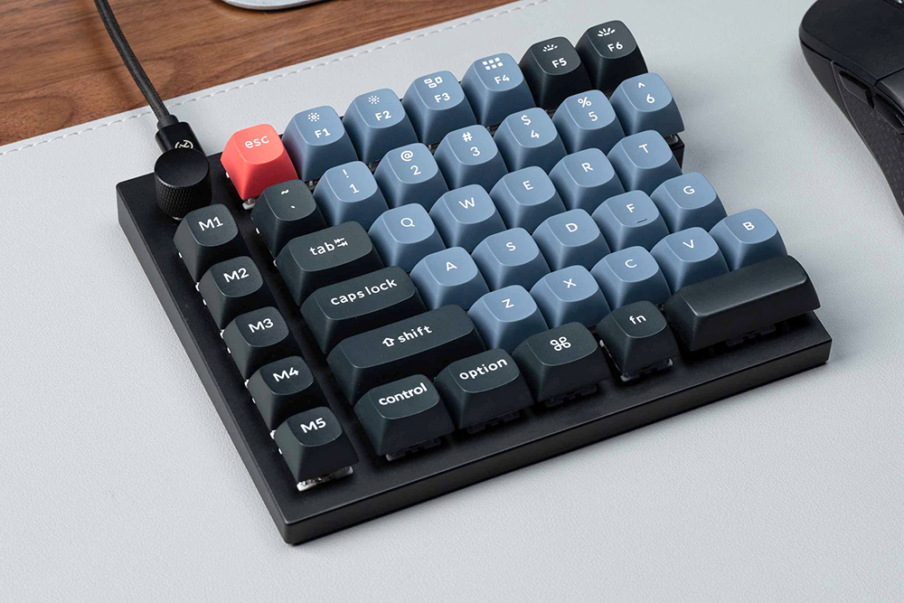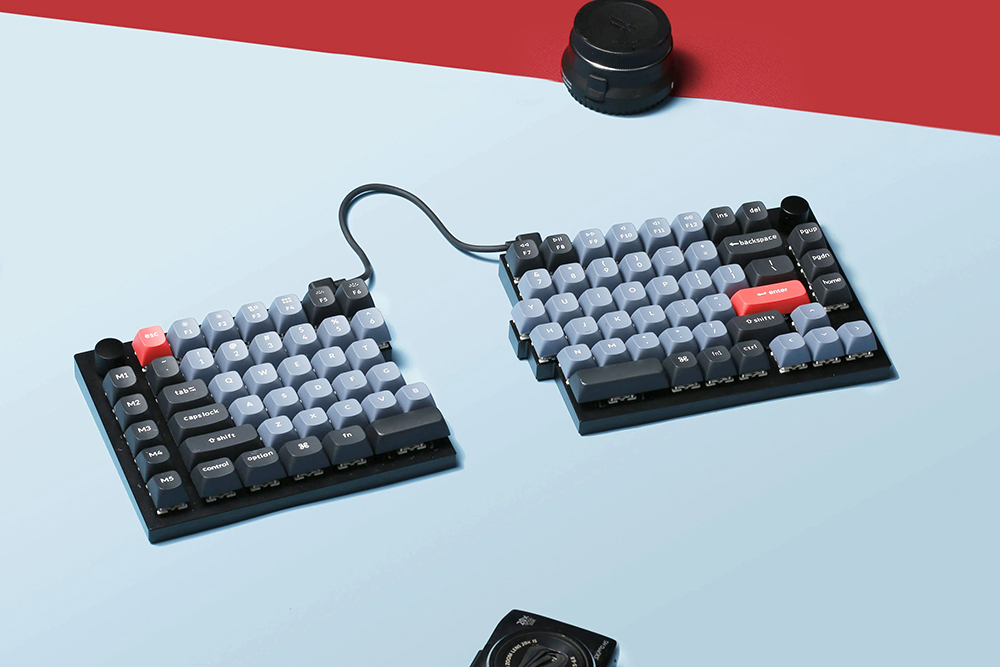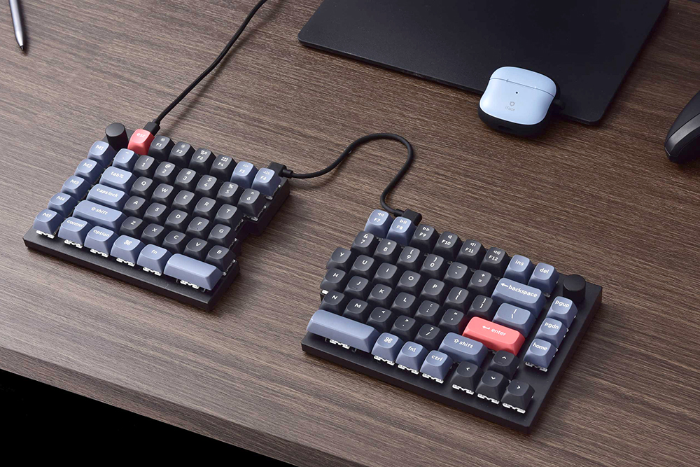 키크론 Q12 스플릿 기계식 키보드는 좌우 분할 레이아웃으로 제작되었습니다. 그리고 두 제품은 브릿지 케이블로 연결된 형태입니다. 특히 유용한 부분은 좌우를 독립적으로 활용할 수 있다는 점입니다. 그리고 좌우 모두에 최근 커스텀 키보드에서 유행하고 있는 노브가 장착되어 있습니다.