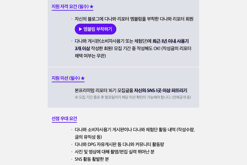 프리미엄 리포터 16기에 지원하기 위해서는 우선 자신의 블로그에 엠블럼을 부착해야 하고 다나와 게시판(소비자 사용기 혹은 체험단)에 1년 이내에 3개 이상의 글을 작성했어야 합니다. 아직 기회가 있으니 늦지 않습니다.