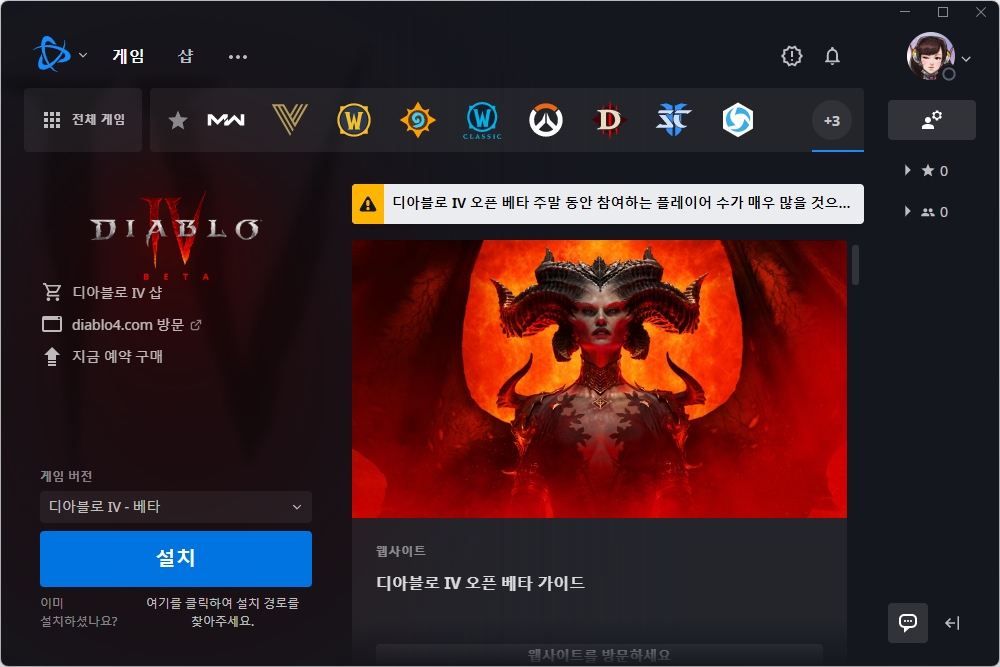 배틀넷 클라이언트의 디아블로4 파트를 확인해 보면 디아블로4 – 베타 버전을 다운로드 받을 수 있는 메뉴가 준비되어 있습니다. 용량은 고해상도 애셋을 포함해서 85.2GB로 작은 편은 아니라고 할 수 있습니다.