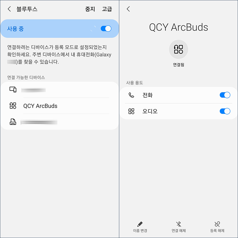 QCY HT07 노이즈 캔슬링 이어폰의 연결 방법을 확인해 보면 우선 충전이 완료된 이어버드를 꺼내면 자동으로 페어링 모드로 들어가고 스마트폰의 검색 기능을 통해서 QCY ArcBuds 라는 제품을 선택해주면 됩니다.