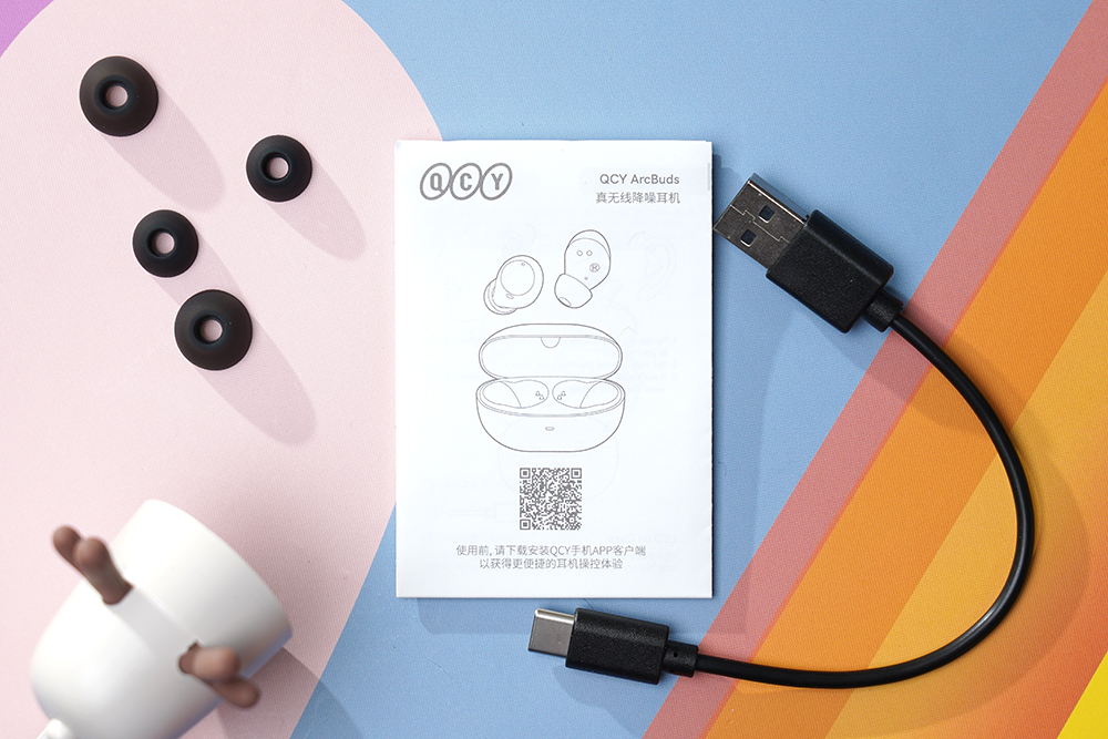 QCY HT07 노이즈 캔슬링 이어폰의 구성품을 살펴보면 충전을 위한 짧은 길이의 USB-C 케이블과 여분의 이어팁 그리고 설명서가 포함되어 있습니다. 준수한 수준의 구성이라고 생각되었습니다.