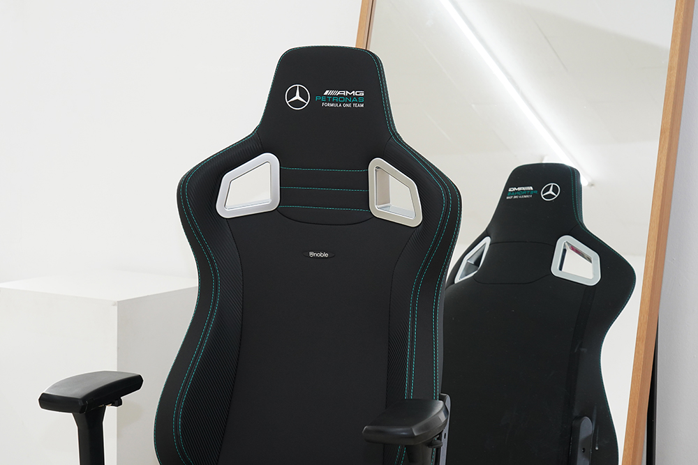 F1 레이싱카들은 보통 무게와 내구성 때문에 카본 파이버로 제작되는 경우가 많습니다. 그래서 노블체어 에픽 메르세데스 F1 에디션 게이밍 의자도 디자인적인 통일성을 위해서 옆면에 카본 이펙트 룩의 사이드월이 적용되었습니다.