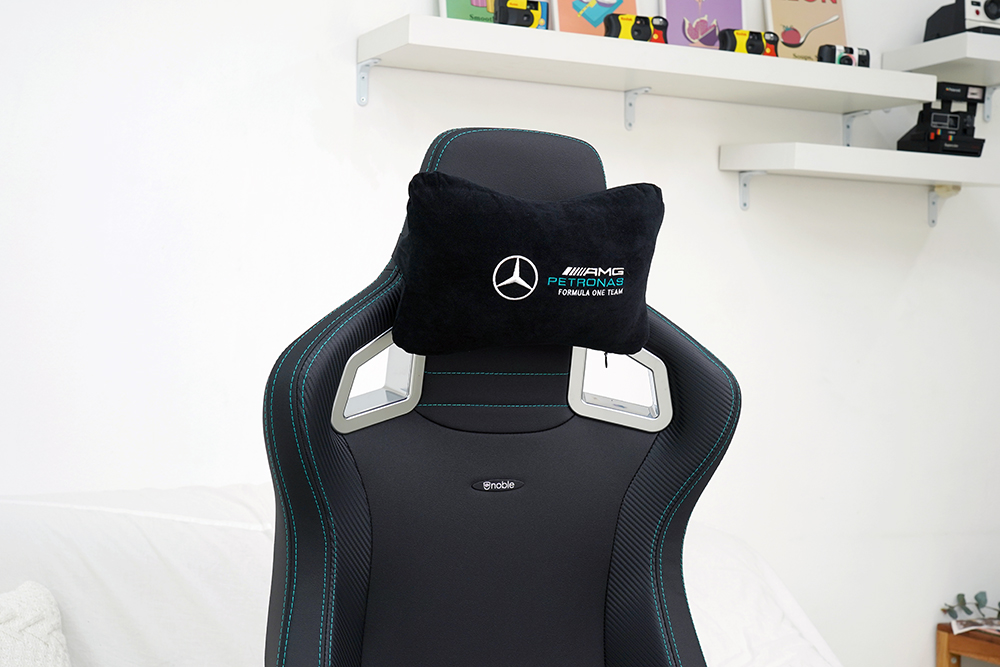 노블체어 에픽 메르세데스 F1 에디션 게이밍 의자의 디자인적인 특징들을 자세하게 살펴보면 우선 머리 받침에 정밀하게 자수가 놓아져 있는 MERCEDES-AMG PETRONAS FORMULA ONE TEAM 로고가 인상적이었습니다. 게임용 의자에서 이런 정도의 디테일을 찾아보기는 어려운 것 같습니다.