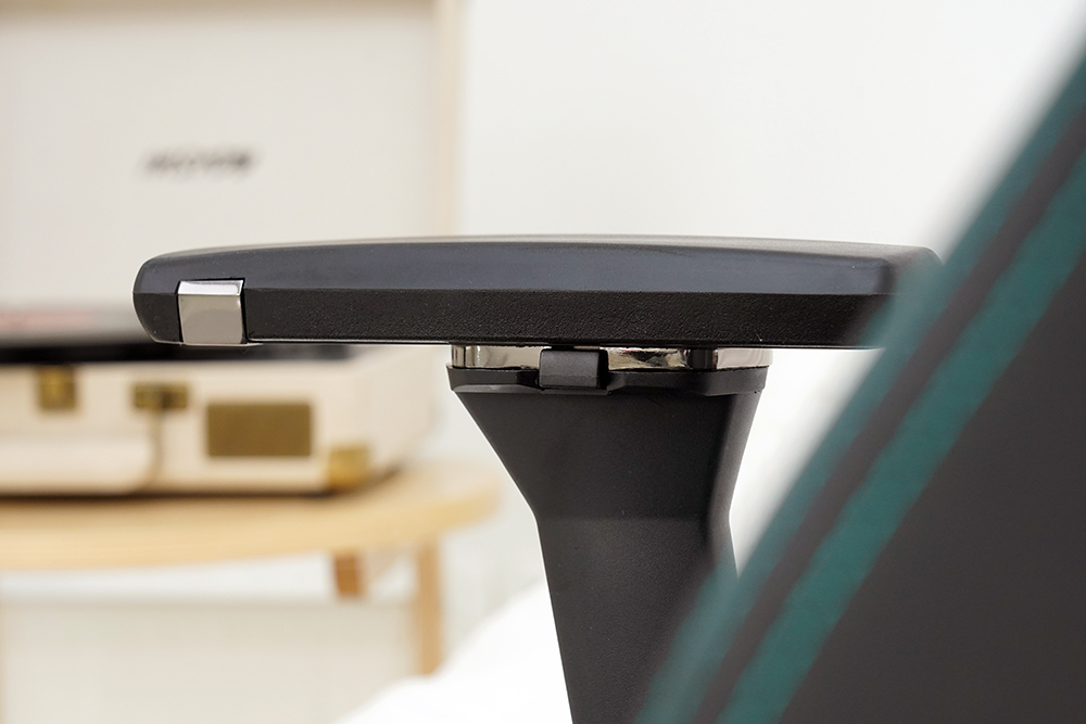 팔걸이의 안쪽을 확인해 보면 앞쪽에는 각도나 앞뒤로 조절할 수 있는 버튼이 배치되어 있고 중간에 장착된 버튼을 이용해서 좌우로 팔걸이를 밀 수 있습니다. 생각했던 것 이상으로 팔걸이의 완성도가 높은 편이라고 생각되었습니다.