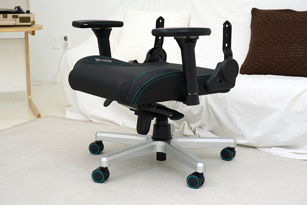 노블체어 에픽 메르세데스 F1 에디션 게이밍 의자는 135도까지 등받이의 각도를 조절할 수 있습니다. 게임을 플레이한 후나 작업을 마치고 잠깐의 휴식을 취하고 싶을 때 활용하면 좋은 편이었고 특히 완전히 젖힌 상태에서도 안정적으로 몸을 받쳐준다는 점이 차별화된 특징이라고 판단되었습니다.