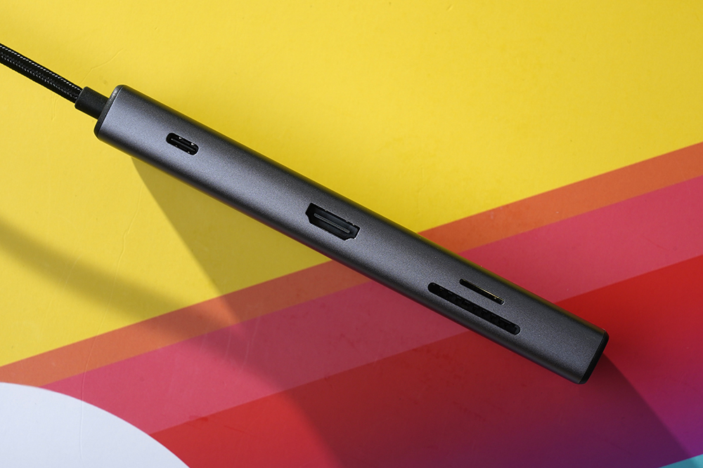 유그린(UGREEN) USB-C 9in1 허브에는 짧은 길이의 USB-C 케이블이 기본으로 장착되어 있습니다. 특히 케이블 자체가 페브릭 소재로 코팅이 되어 있는 것은 물론이고 본체와 연결된 부분도 내구성이 우수하다고 합니다.