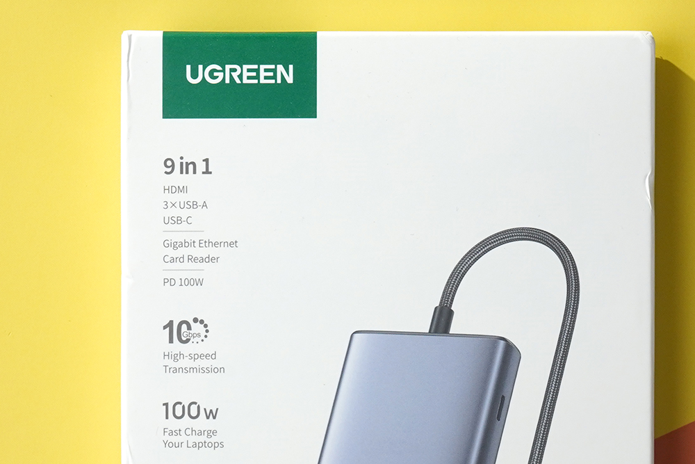 유그린(UGREEN) USB-C 9in1 허브의 박스는 심플한 스타일로 디자인되었습니다. 그리고 전면에는 주요 특징들이 설명되어 있는데요. 9 in 1으로 설계되어서 다양한 기능들이 탑재되었고 최대 10Gbps의 속도를 제공합니다. 그리고 PD 100W 고속 충전 기능도 지원합니다.