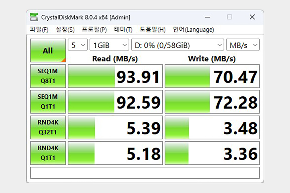 유그린(UGREEN) USB-C 9in1 허브의 SD카드 리더기의 속도를 살펴보면 읽기는 93MB/s, 쓰기는 70MB/s 정도로 무난한 편이었고 빠른 속도의 외장 SSD를 연결해서도 사용할 수 있습니다. 참고로 일부 포트들은 10Gbps의 속도를 지원합니다.