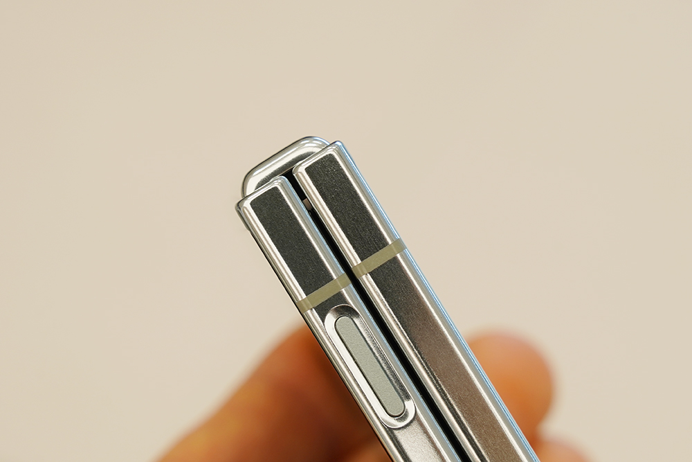 갤럭시 Z 플립5의 옆면을 살펴보면 약간은 플랫한 느낌의 메탈로 제작되었고 잠금 해제를 위한 지문인식 센서가 배치되어 있습니다. 위치는 적절한 편이라고 판단되었습니다.