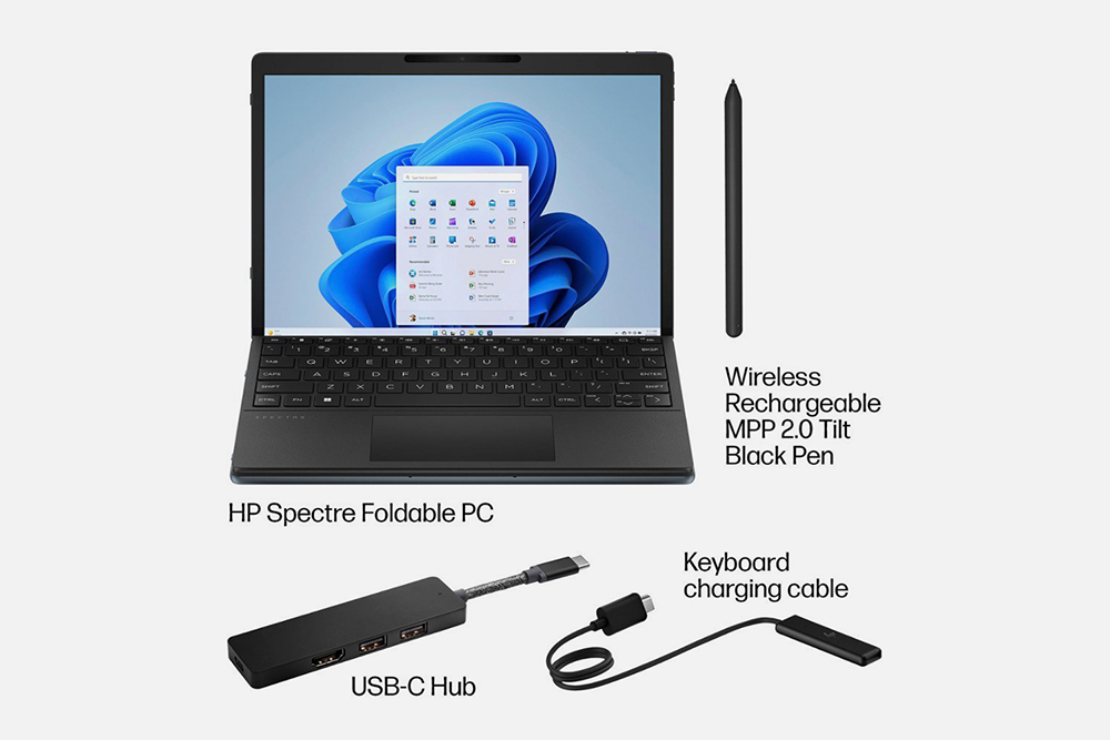 HP 스펙터 폴더블 PC(17-cs0013dx)의 구성품을 살펴보면 본체와 무선 충전 키보드 그리고 펜과 USB-C 허브, 키보드 충전 케이블로 구성되어 있는 것을 확인할 수 있습니다.