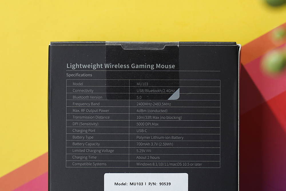 박스의 뒷면에는 유그린 MU103 무선 게이밍 마우스의 스펙이 표시되어 있습니다. 주목할 만한 부분은 USB, 2.4GHz, 블루투스 트라이 모드를 지원한다는 점입니다. 그 외에도 최대 5,000DPI와 마이크로소프트 윈도우는 물론이고 애플 맥OS에서도 사용할 수 있습니다.