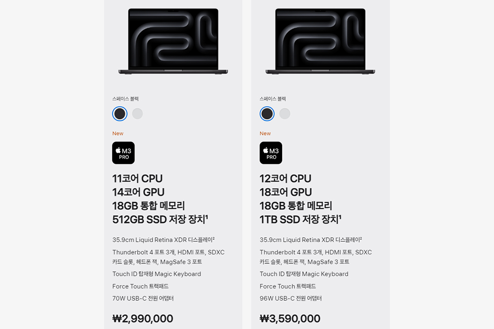 M3 프로 칩을 탑재한 맥북프로 14인치는 드디어 스페이스 블랙을 선택할 수 있습니다. 11/12코어 CPU와 14/18코어 GPU 그리고 18GB 통합 메모리와 512GB/1TB SSD 저장 장치를 갖춘 모델의 가격은 299만원과 359만원입니다. 참고로 299만원짜리 제품의 미국 출시 가격은 $199입니다. 역시 환율의 영향을 크게 받은 것으로 보입니다.