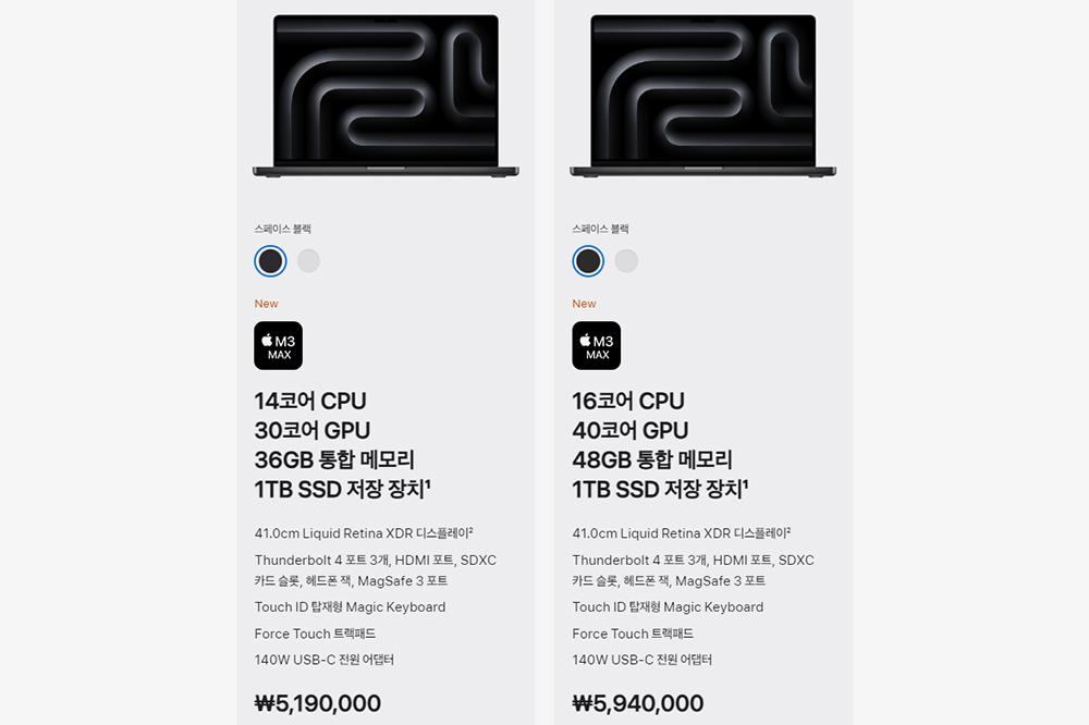 M3 맥스 칩을 탑재한 맥북프로 16인치 모델은 14/16코어 CPU와 30/40코어 GPU 그리고 36GB/48GB 통합 메모리와 1TB SSD 저장 장치를 탑재했습니다. 가격은 519만원과 594만원으로 책정되었습니다.
