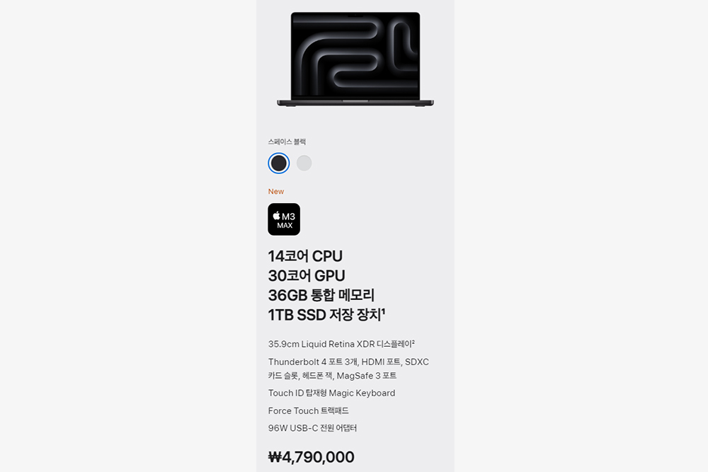 M3 맥스 칩을 탑재한 맥북프로 14인치 모델은 14코어 CPU와 30코어 GPU 그리고 36GB 통합 메모리와 1TB SSD 저장 장치를 갖추고 있고 가격은 479만원입니다. 재미있는 부분은 메모리의 용량이 32GB가 아닌 36GB이라는 독특한 용량을 채택했다는 점입니다.