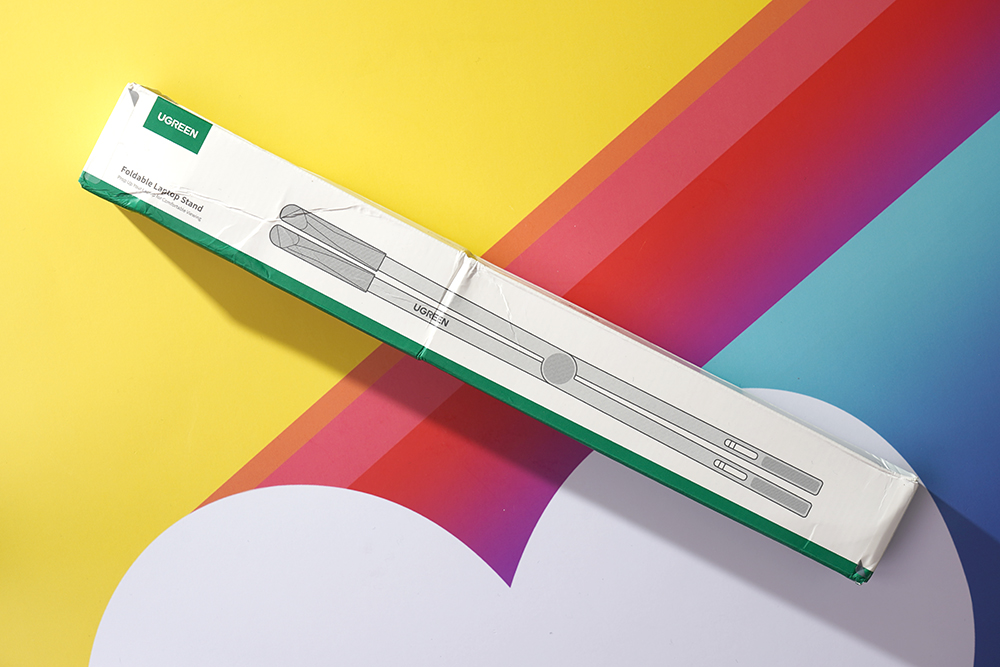 유그린 휴대용 노트북 스탠드 거치대의 박스는 기다란 형태로 제작되었습니다. 디자인 자체는 심플한 느낌을 주는 편이고 겉면에는 Foldable Laptop Stand라는 문구가 인쇄되어 있습니다.