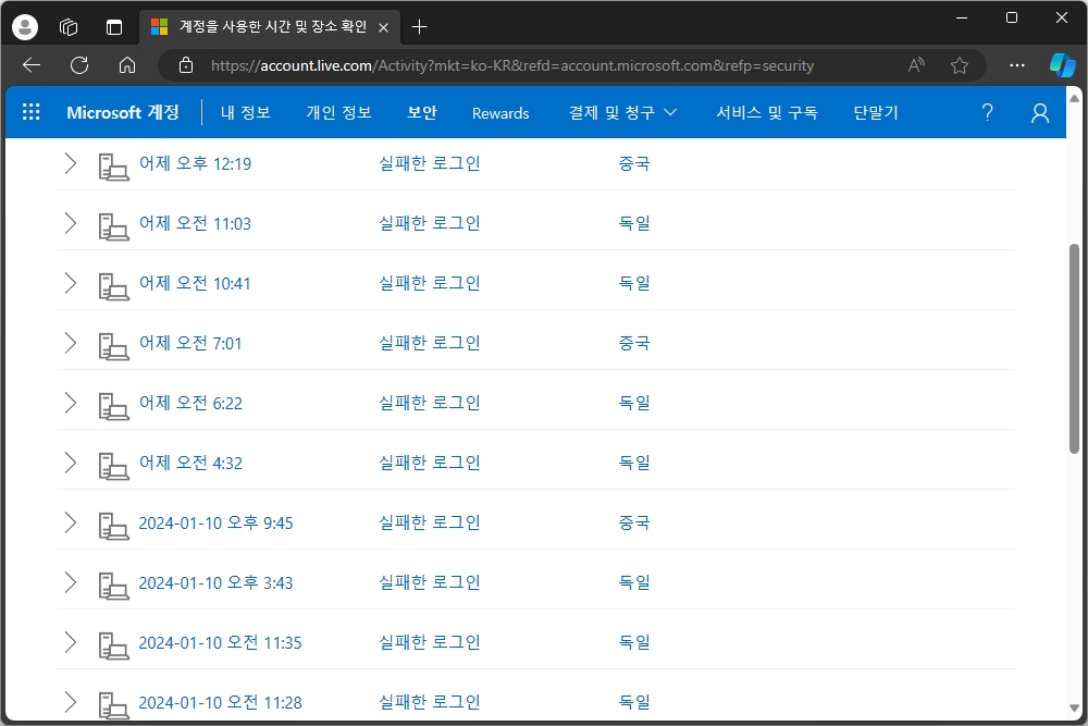 그리고 아래쪽에 배치된 로그인 활동을 살펴보면 2024년 1월 10일부터 이후까지 독일이나 중국 IP를 통해서 로그인 시도가 진행되고 있는 것을 확인할 수 있습니다. 대대적인 계정 탈취 공격이 시도되고 있는 것으로 보입니다.