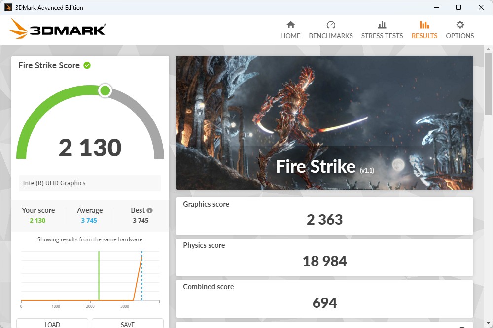 ASUS 비보북 16X K3604VA-MB145에는 인텔® UHD Graphics 내장 그래픽카드가 탑재되었습니다. 3DMARK를 이용해서 성능을 살펴보면 파이어 스트라이크는 2,130점, 타임 스파이는 1,022점으로 측정되었습니다.