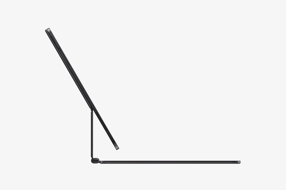 아이패드 프로 M4 모델용 매직 키보드는 기계 가공된 알루미늄 소재의 견고한 힌지가 적용되었습니다. 그래서 자신이 원하는 각도로 아이패드를 조절해서 사용할 수 있습니다.