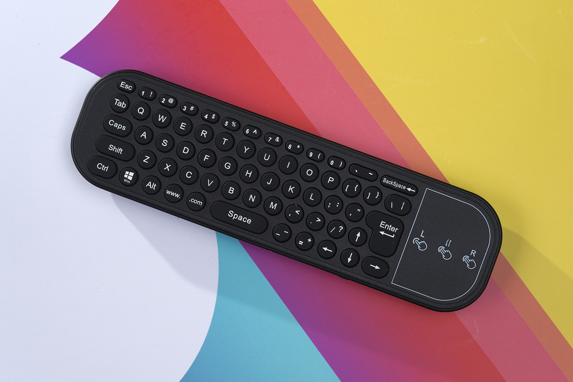 60S PRO 무선 에어 마우스는 양면으로 구성되어 있는데요. 우선 위쪽은 일반적인 리모컨처럼 디자인되어 있습니다. 그리고 에어 마우스로 동작해서 먼 거리에서도 컴퓨터를 제어할 수 있다는 점이 편리한 부분입니다. 그 외에도 IR 학습 기능을 지원해서 TV를 켜고 끌 수도 있습니다.