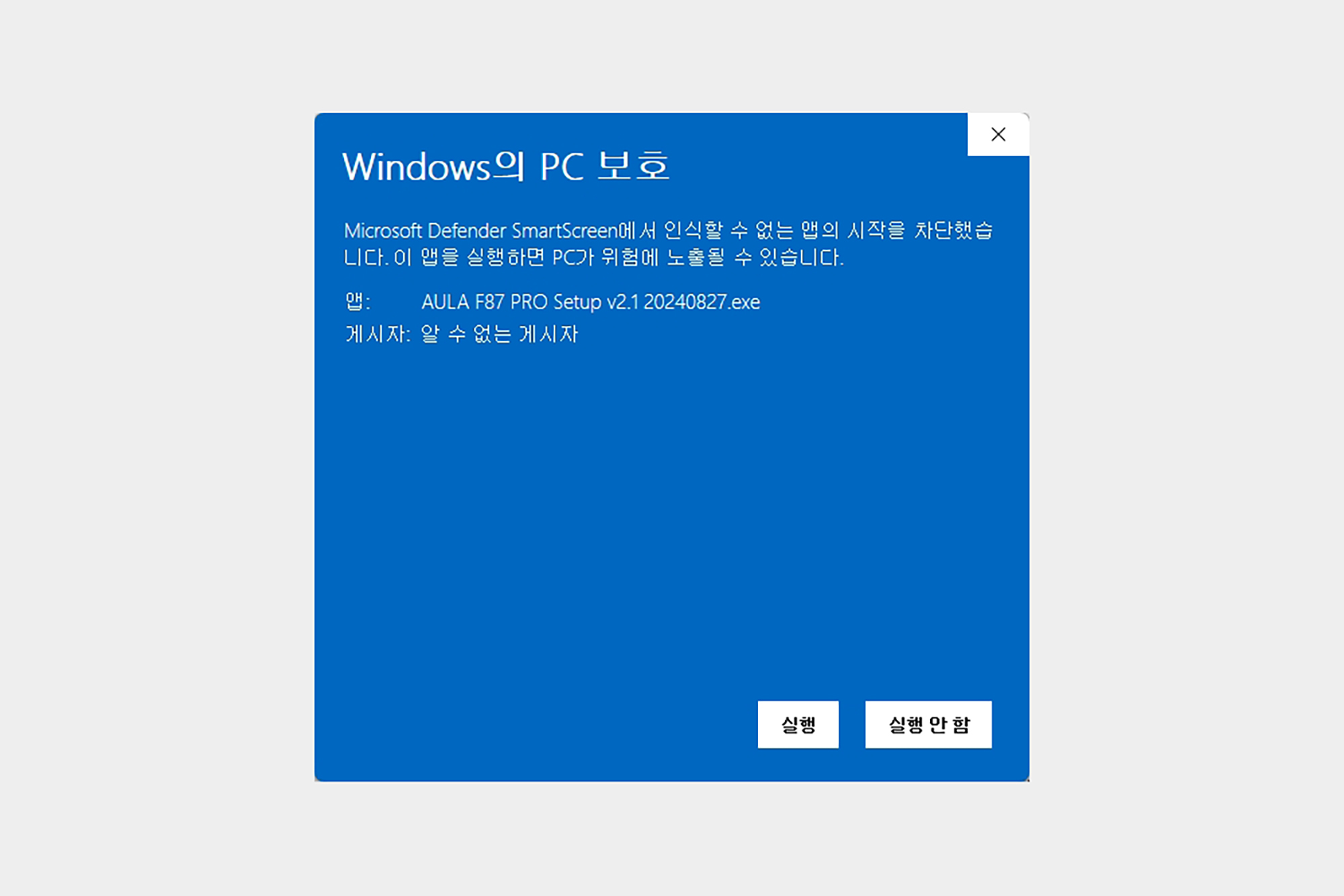 독거미 F87 PRO 유무선 키보드의 소프트웨어는 펀키스 홈페이지에서 다운로드 받을 수 있습니다. 그런데 중국에서 제작된 프로그램이라서 Windows의 PC 보호 기능이 실행되고 추가 정보를 눌러서 실행시킬 수 있습니다. 꺼림칙하다고 생각되는 분들은 설치를 하지 않는 것이 좋을 것 같습니다.
