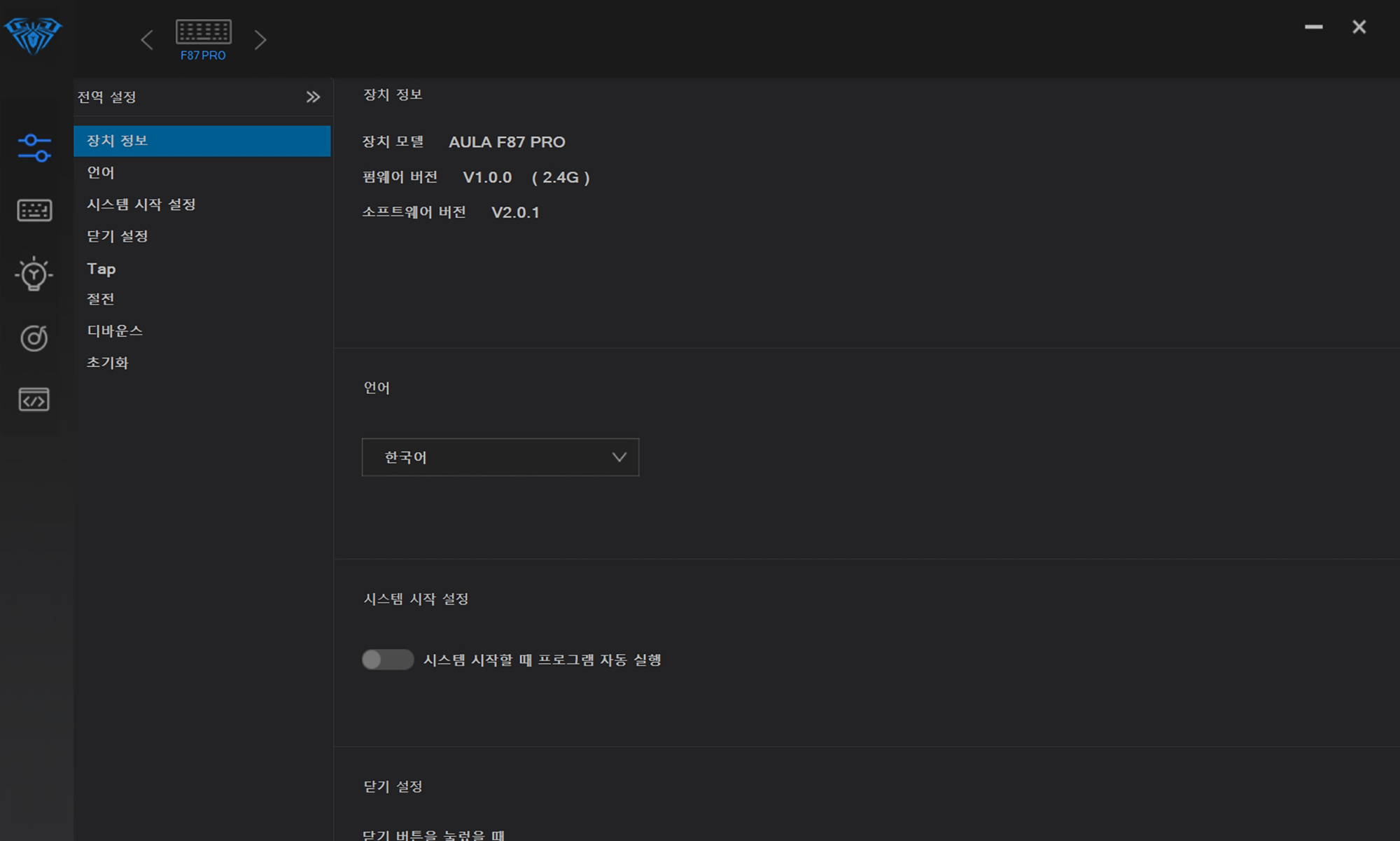 독거미 F87 PRO 유무선 키보드 소프트웨어의 전역 설정을 살펴보면 장치 정보에서 펌웨어 버전을 확인할 수 있고 언어를 한국어로 설정하거나 절전 시간을 조절하고 초기화를 할 수 있는 메뉴도 준비되어 있습니다. 필요에 따라서 활용해 주는 것이 좋을 것 같습니다.