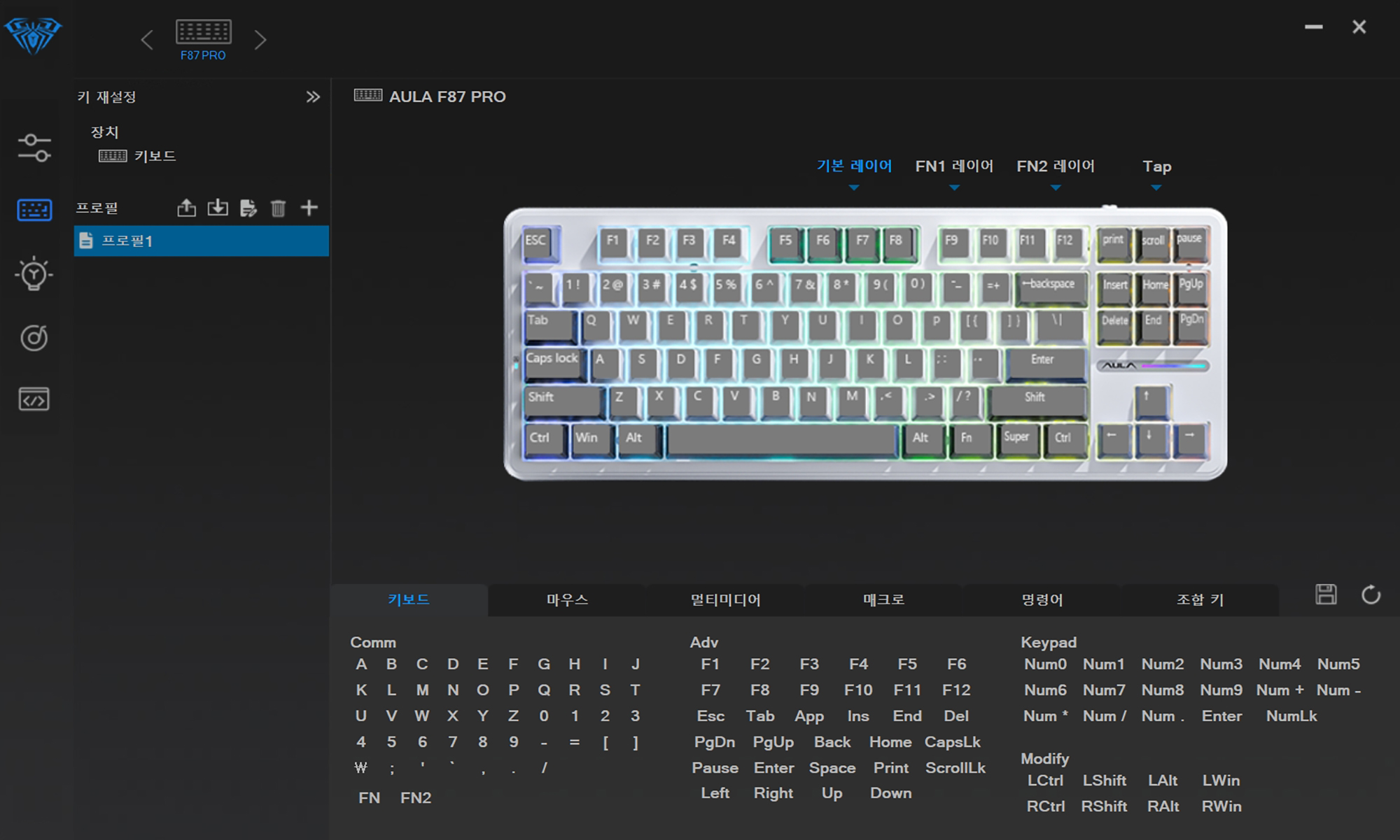 독거미 F87 PRO 유무선 키보드는 자신이 원하는 키에 키보드와 마우스 그리고 멀티미디어와 매크로, 명령어, 조합키 기능을 할당할 수 있습니다. 텐키리스 키보드라서 여유키가 있지는 않지만 FN키와 조합해서 사용하는 것을 추천합니다.
