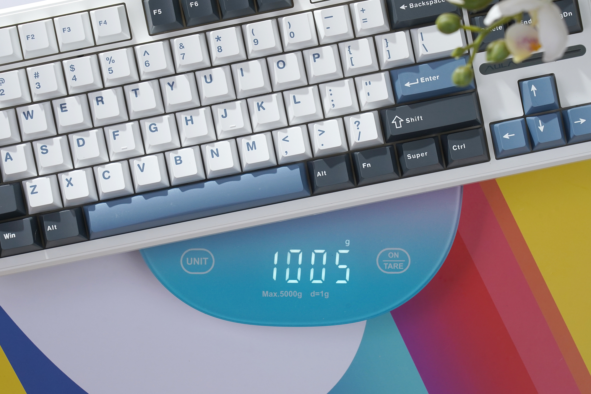 독거미 F87 PRO 유무선 키보드의 무게는 2.4G USB 수신기를 포함해서 약 1.005kg으로 측정되었습니다. 알루미늄으로 제작되는 커스텀 키보드와 비교하면 가벼운 편이지만 플라스틱 제품 중에서는 묵직한 편입니다. 키보드는 무게가 무거울수록 조금 더 안정적인 타건감을 제공하는 것 같습니다.
