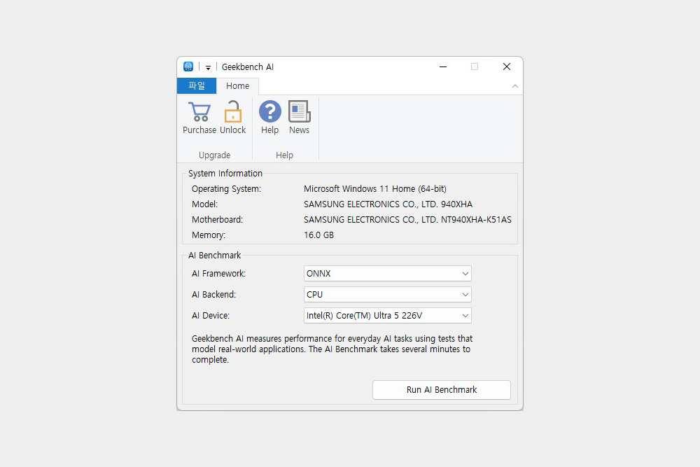 Geekbench 긱벤치 AI 벤치마크 소프트웨어를 설치하면 AI Framework를 선택할 수 있는데요. ONNX에서는 CPU만 선택할 수 있고 OpenVINO를 선택해야지만 NPU가 활성화됩니다. 필요에 따라서 프레임워크와 백엔드를 선택하는 것이 좋을 것 같습니다.