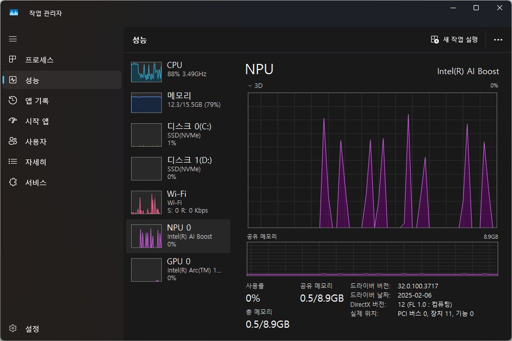 최근에 출시된 인텔 프로세서를 탑재한 노트북에서 작업 관리자를 확인해 보면 CPU와 메모리 등의 정보와 함께 NPU 0 Intel AI Boost라는 항목이 표시되는데요. 일상적인 작업을 할 때 해당 기능이 활성화되는 것은 거의 보기 어렵습니다.