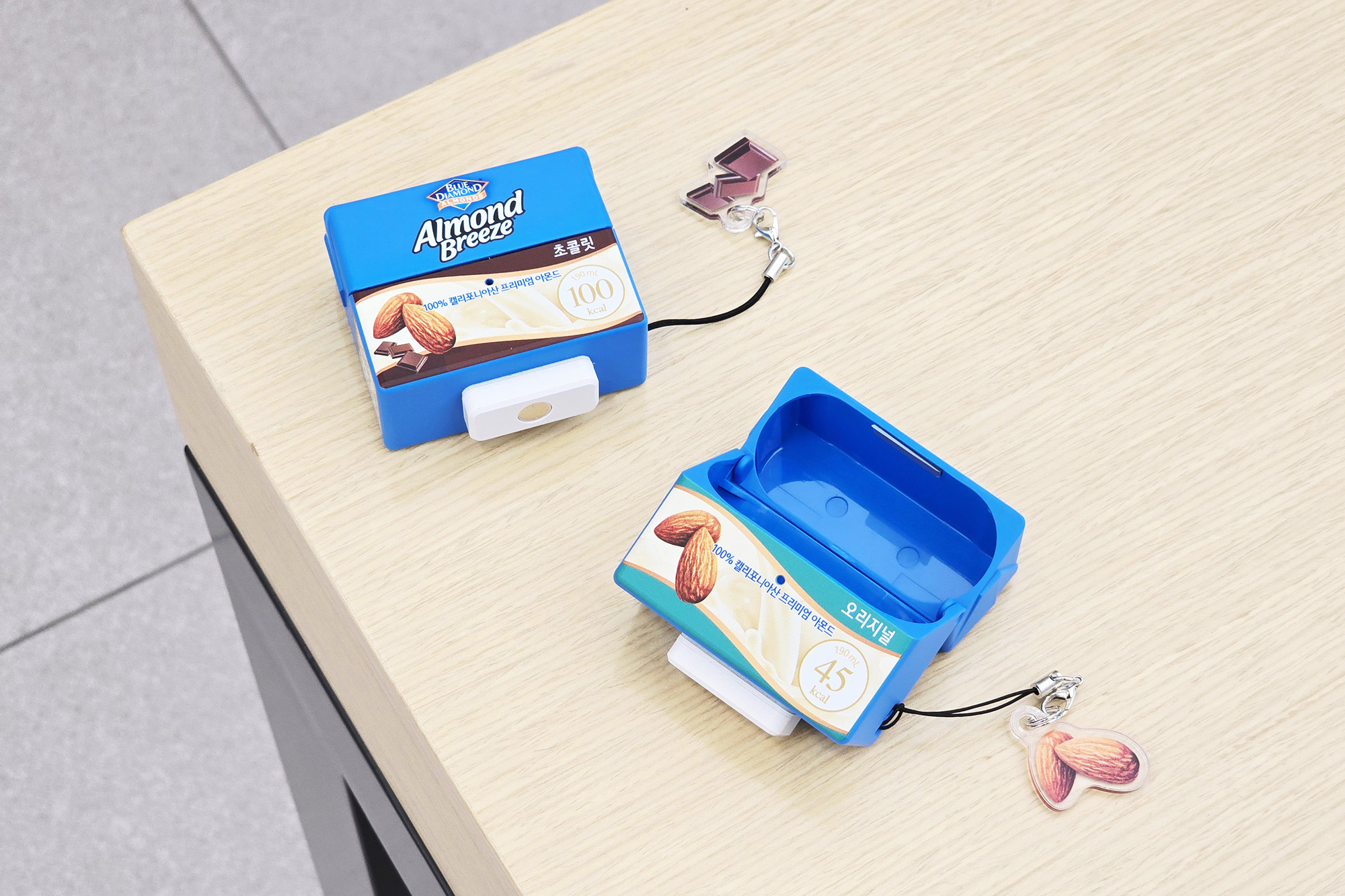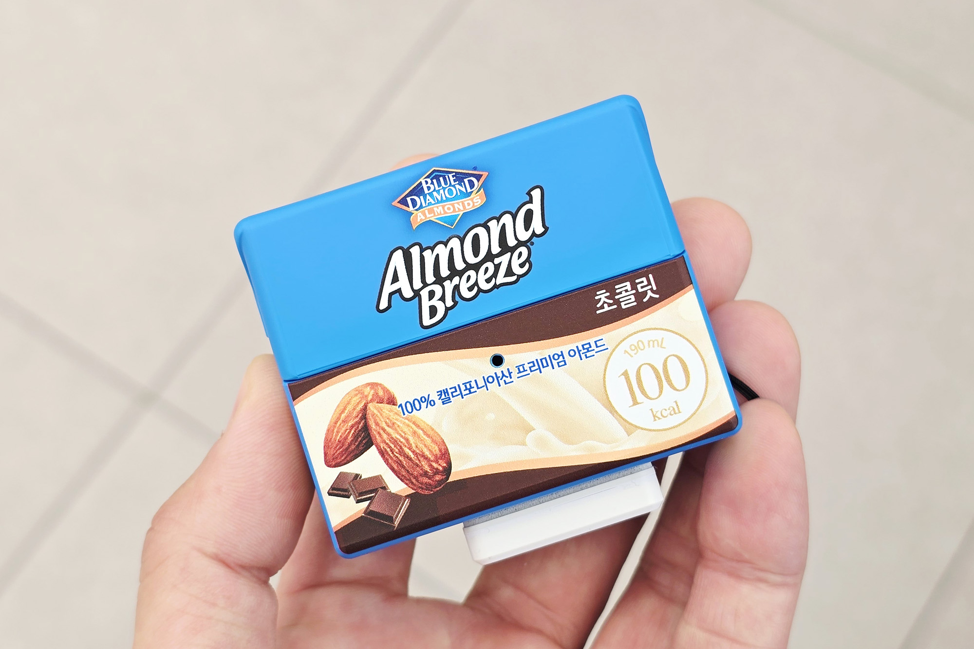 아몬드브리즈 오리지널 케이스를 자세하게 살펴보면 용량이나 칼로리 그리고 유통기한과 영양 정보까지 상당히 구현이 잘되어 있는 것을 확인할 수 있고 앙증맞은 디자인의 아몬드 키링이 부착되어 있습니다. 평소에 다이어티를 위해서 아몬드브리즈를 즐기는 분들이라면 상당히 메리트가 있을 만한 제품이라고 생각되었습니다.