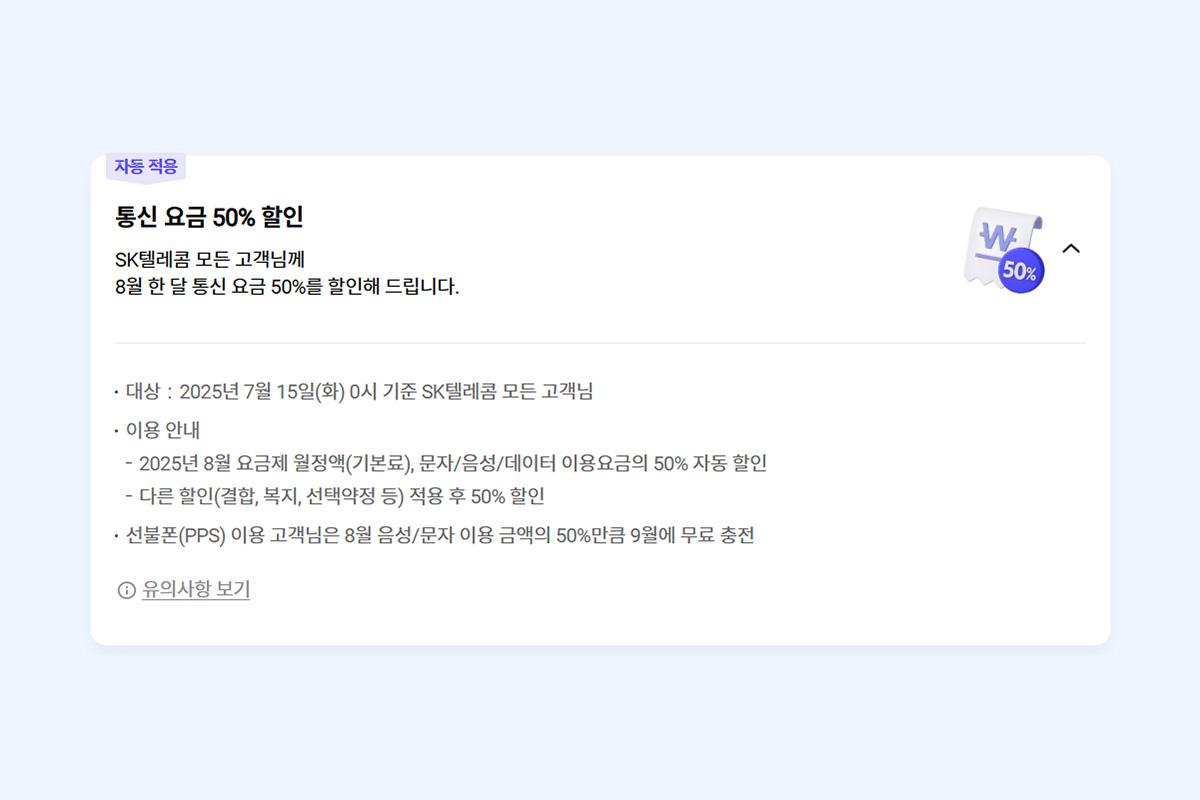 우선 모든 고객의 8월 한 달 통신 요금을 50% 할인해 준다고 합니다. 자동으로 적용되는 부분이기 때문에 가입자가 별도로 신청할 필요는 없다는 점이 편리나 부분이고 선불폰(PPS)을 사용하는 분들은 9월에 50% 분량이 무료 충전된다고 합니다.