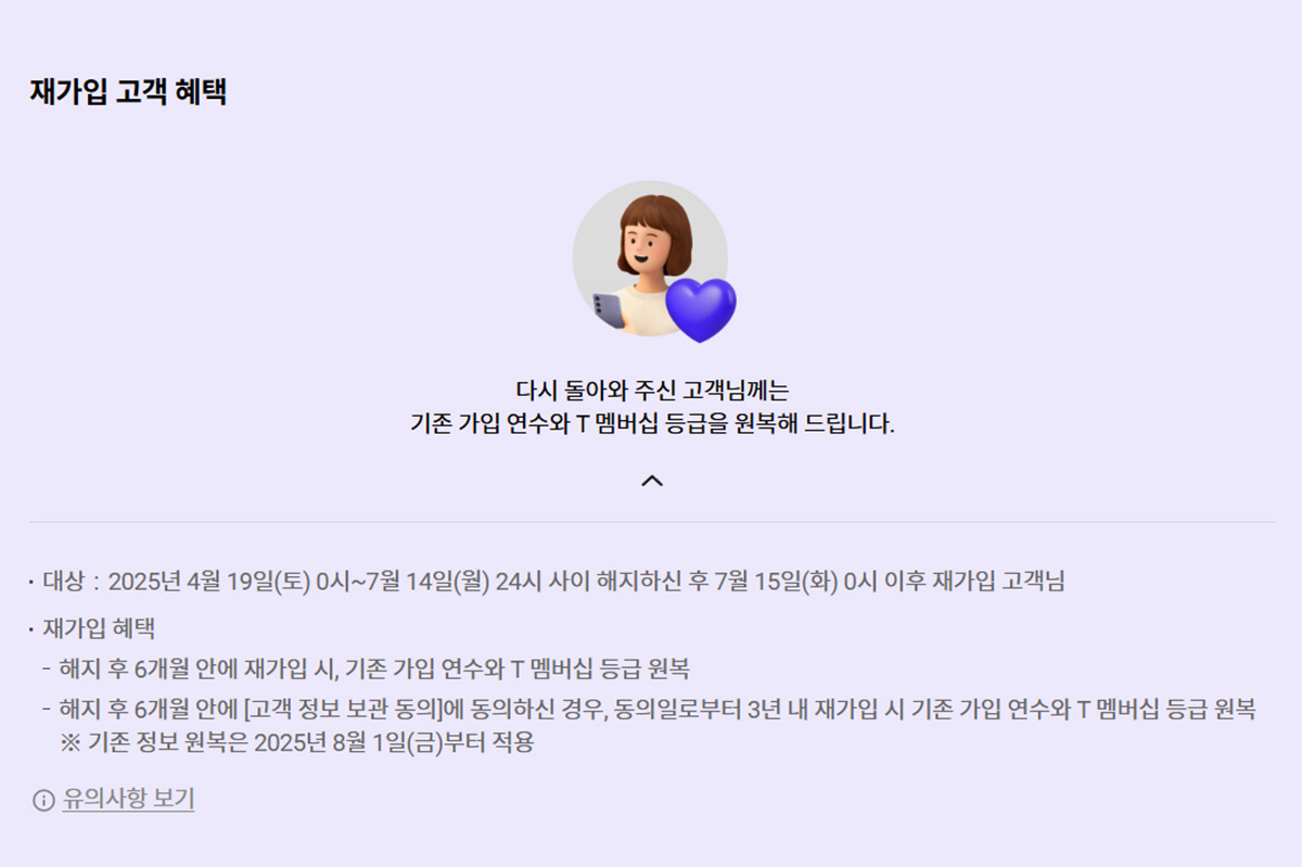 감사 패키지에 포함되어 있지는 않지만 2025년 4월 19일부터 7월 14일 사이에 해지한 사람 중에서 6개월 안에 재가입 시에는 기존 가입 연수와 T 멤버십의 등급을 원복해 준다고 합니다.