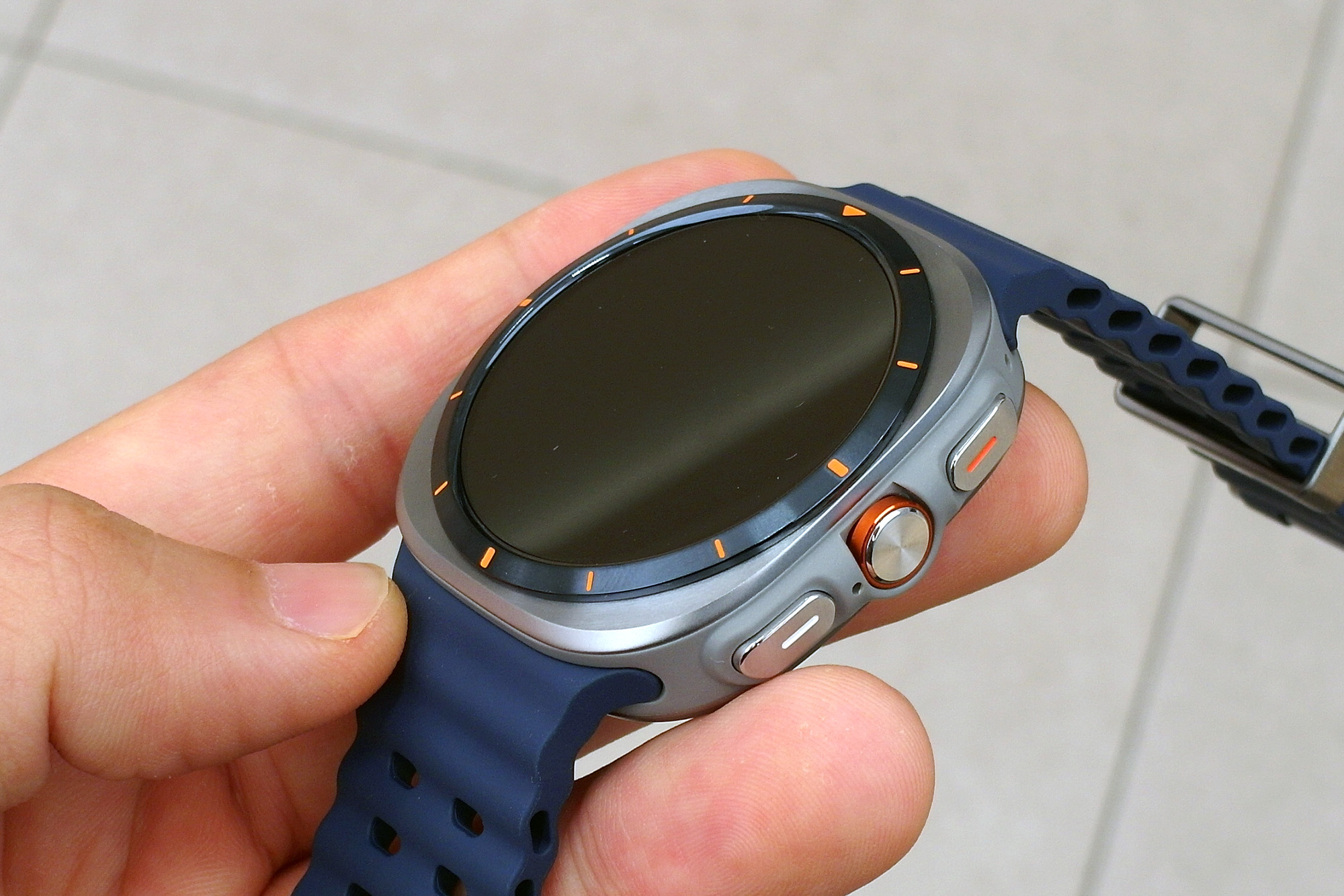 제가 가장 마음에 들었던 컬러는 삼성 갤럭시 워치 울트라 티타늄 그레이입니다. 모서리 엣지 부분을 제외하고는 어두운 느낌의 무광으로 마무리되었는데요. 오렌지 컬러의 스트랩과 매칭이 좋은 편이라고 생각되었습니다. 그런데 오렌지 밴드 때문에 애플워치 울트라와 유사하다는 의견이 있었습니다.