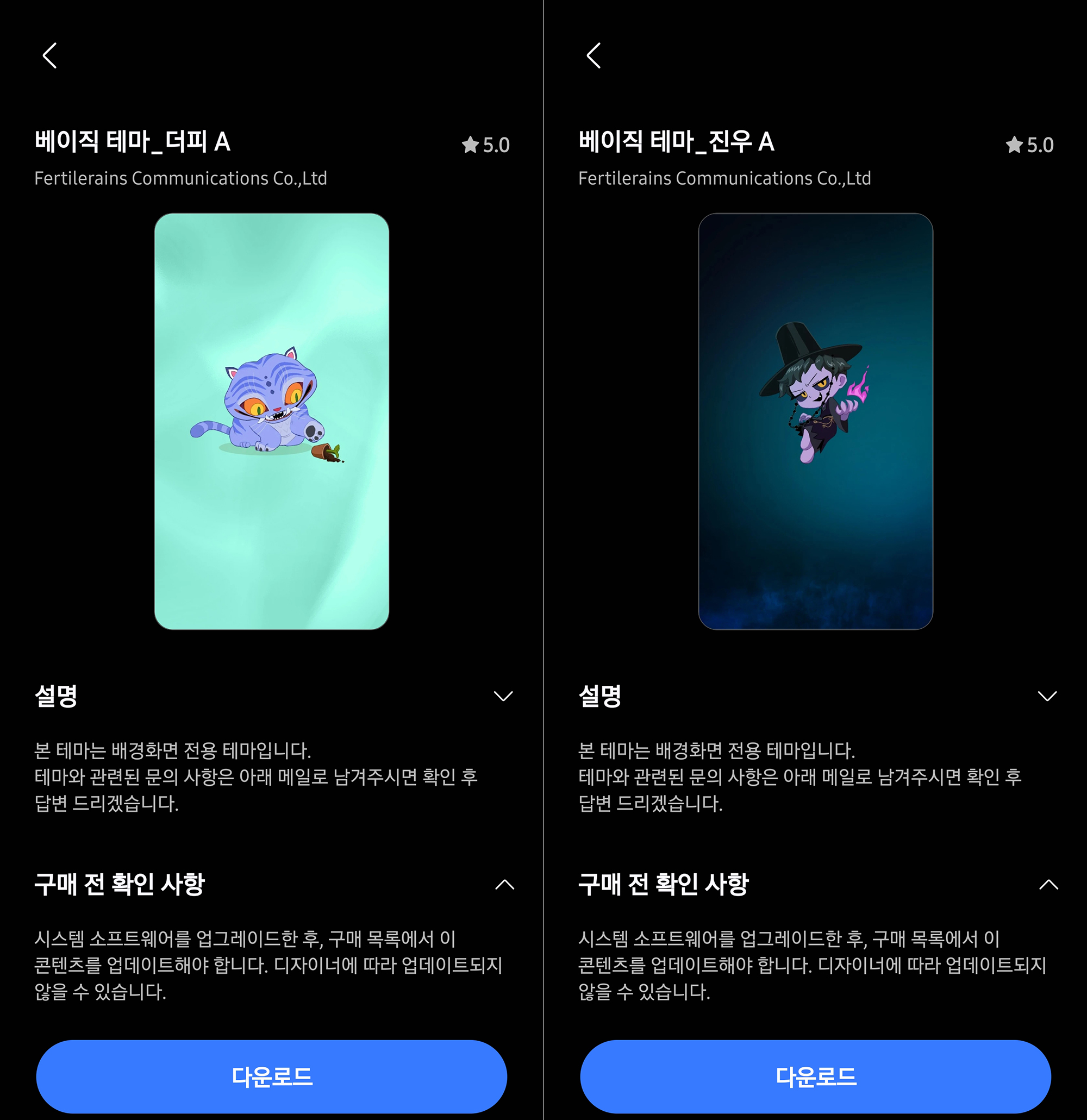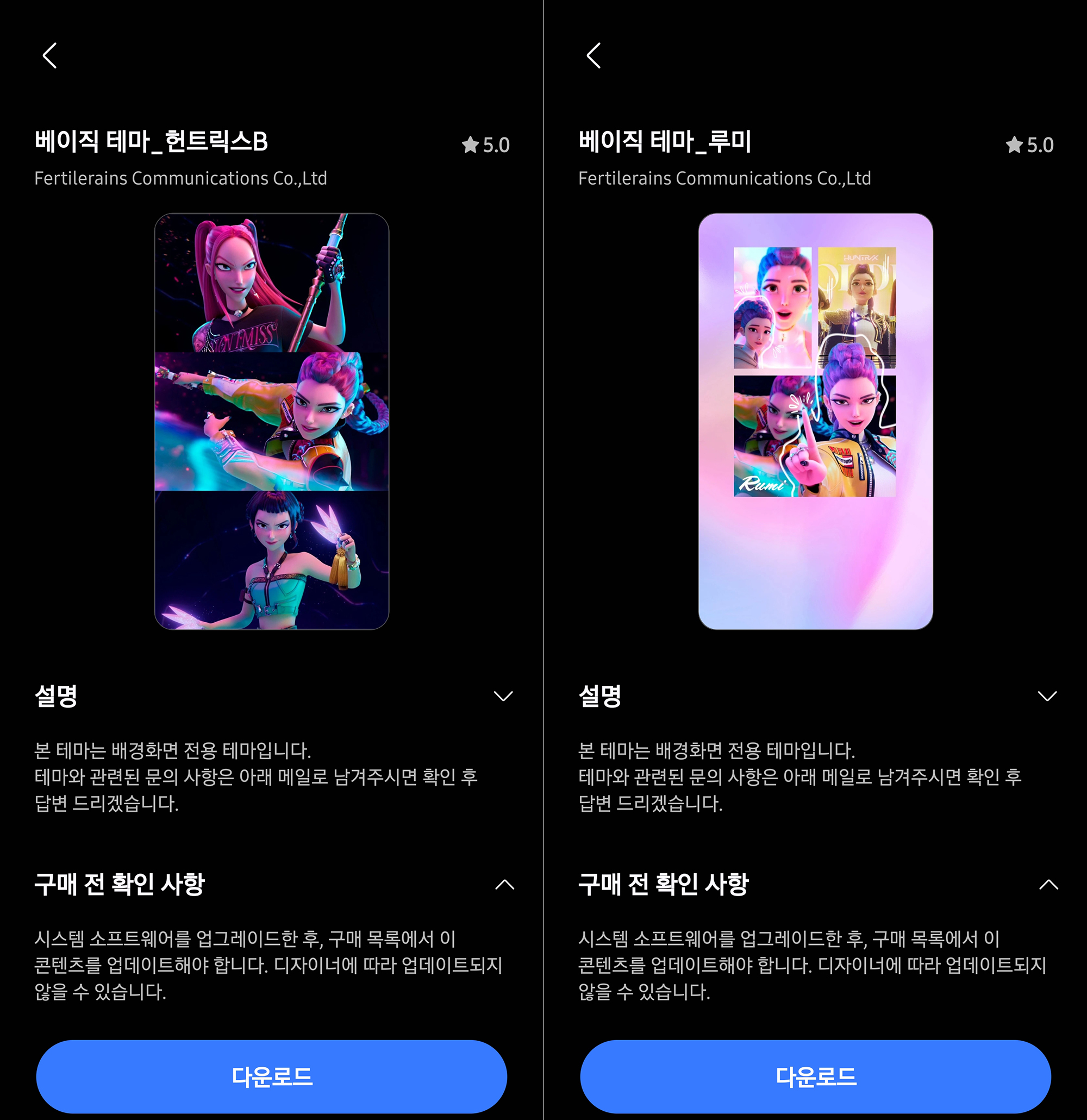 넷플릭스 앱을 실행시키면 바로 케이팝 데몬 헌터스로 연결이 되고 다시 갤럭시 스토어로 돌아오면 스페셜 테마(테마 패키지)와 베이직 테마(월페이퍼)로 구분해서 다운로드 받을 수 있는 것을 확인할 수 있습니다.