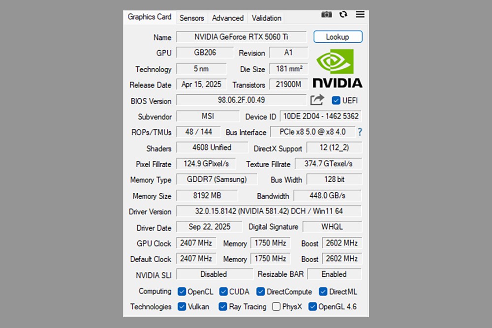 MSI RTX 5060 Ti 벤투스 그래픽카드의 정보를 GPU-Z를 통해서 확인해 보면 GPU는 GB206이고 4,608개의 쿠다 코어를 탑재하고 있습니다. 그리고 AMD 라이젠 5 9600X 프로세서와 함께 테스트가 진행되었습니다.
