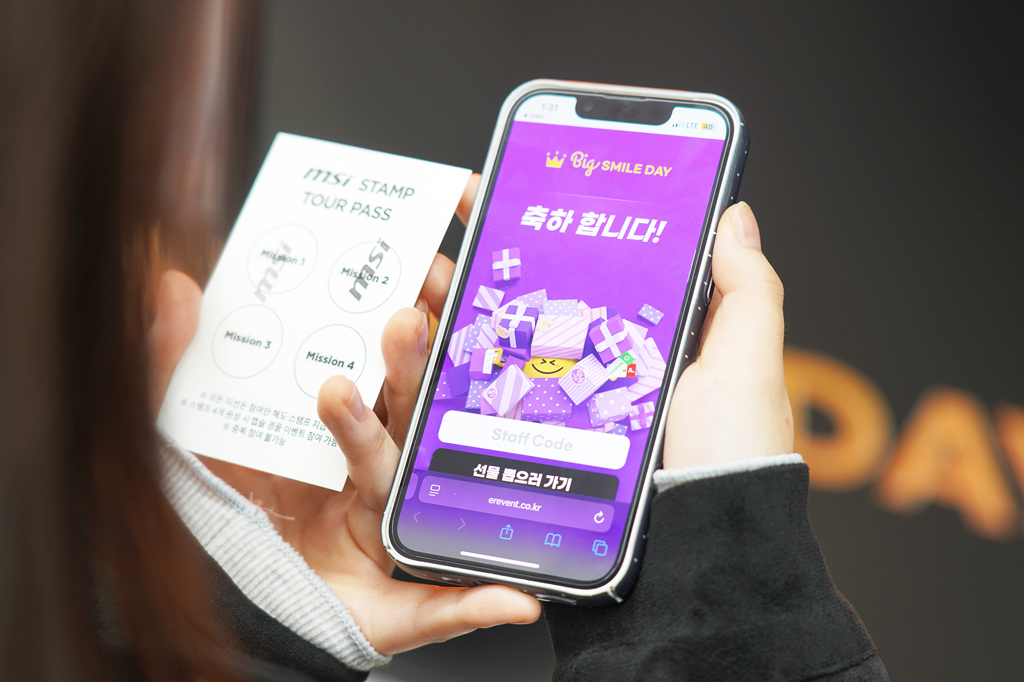 MSI 노트북 팝업 in 성수의 이벤트는 총 4개의 섹션으로 구성되어 있었는데요. 각각의 미션을 수행하고 개별적으로 상품을 받을 수 있는 것은 물론이고 나중에 가챠를 통해서 커다란 사은품을 받을 수 있도록 행사가 구성되어 있었습니다. 첫 번째 미션은 인스타그램에 관련된 부분이었습니다.