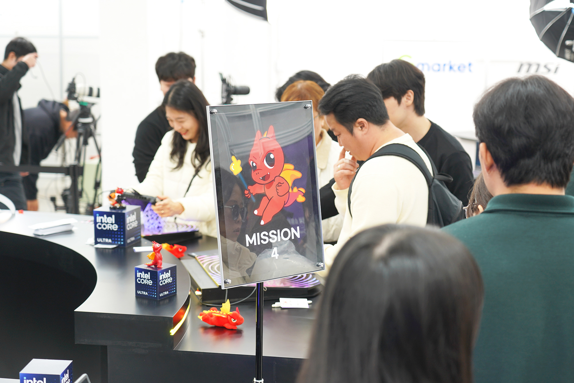 MSI 노트북 팝업 in 성수 행사장에 들어가면 우선 테이블에 어마어마하게 쌓여 있는 MSI 마스코트 럭키(용용이) 인형이 인상적이었고 각종 이벤트에 참여하기 위해서 많은 사람들이 방문해서 MSI의 노트북이나 휴대용 게임기를 체험하고 있다는 인상적이었습니다. 그리고 뒤쪽에는 MSI 노트북 G LIVE 방송이 실제로 준비되고 있었습니다. 방송 연습하는 것을 지켜보는 것도 재미있었습니다.