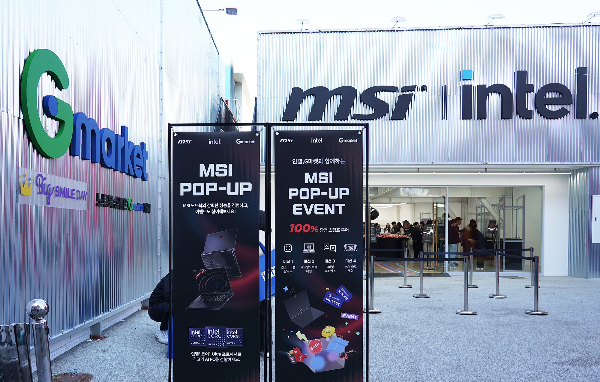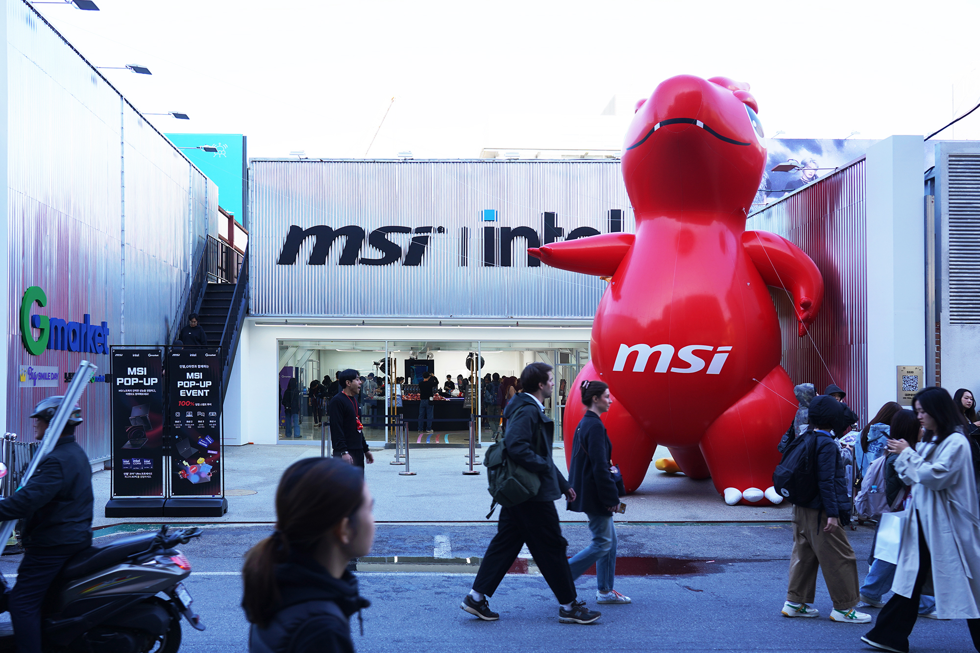 MSI 노트북 팝업 in 성수의 입구를 살펴보면 거대한 럭키(용용이)가 자리를 지키고 있었는데요. 지나가는 사람들이 크기에 많이 놀라는 것이 인상적이었습니다. 그리고 G마켓 빅스마일데이와 MSI 그리고 인텔의 로고가 배치되어 있었고 입간판에 행사 내용이 설명되어 있습니다.
