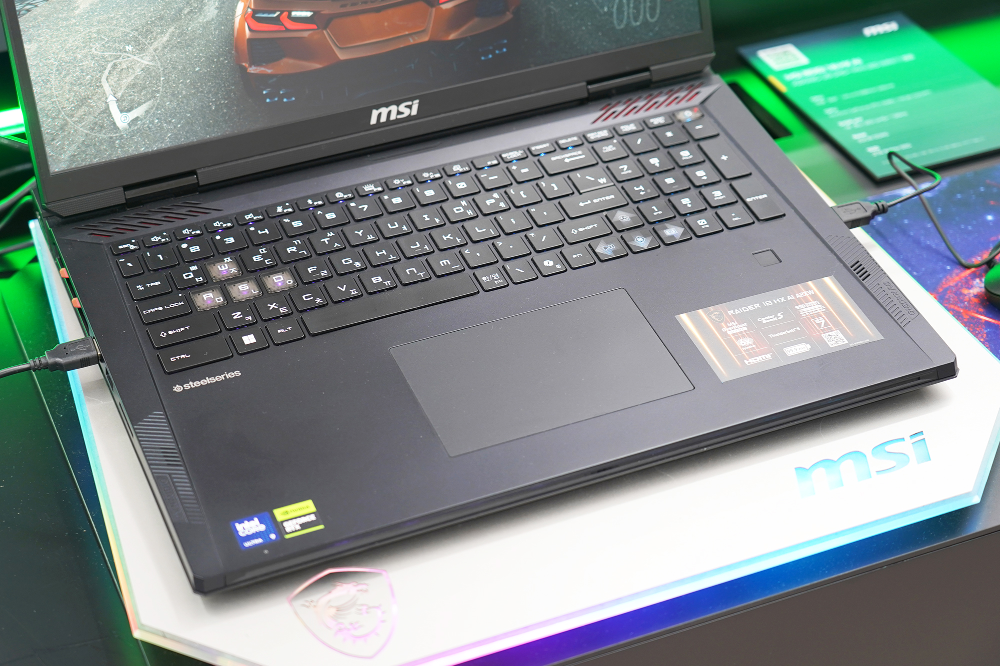 이제부터는 MSI 노트북 팝업 in 성수에 전시된 제품들을 차례대로 정리해 보도록 하겠습니다. 우선 저의 눈길을 끈 제품은 MSI 타이탄 18 HX 드래곤 에디션 Norse Myth였는데요. 무려 900만원대의 가격이 책정되었습니다. 이 정도라면 웬만한 데스크톱 PC는 성능적인 부분에서 앞설 것으로 예상됩니다.
