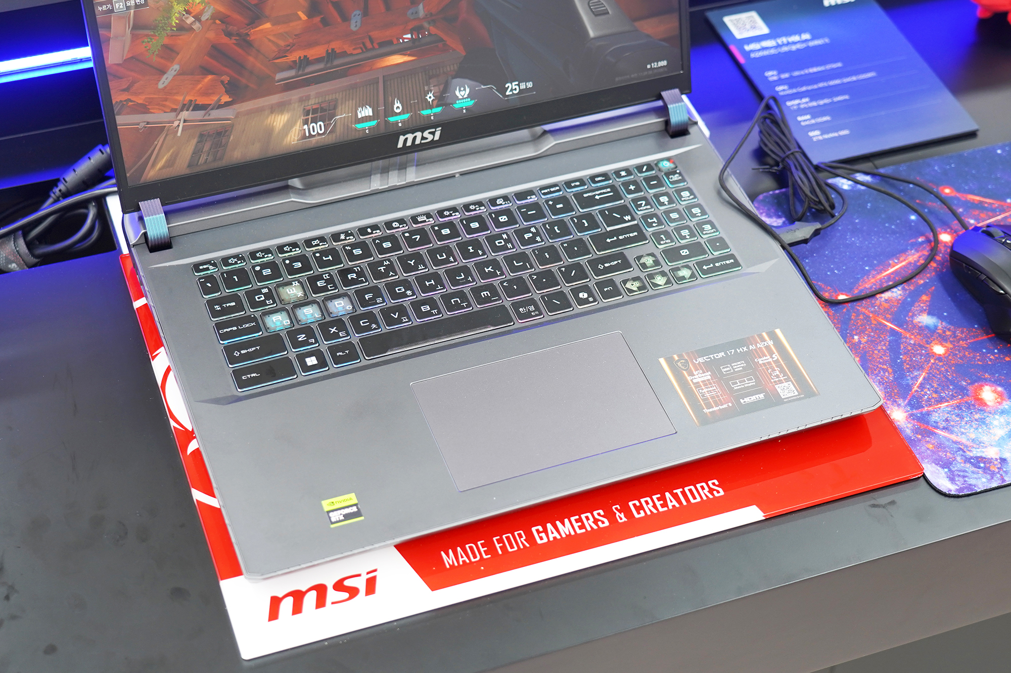 MSI 벡터 17 HX AI는 QHD+ 240Hz 17인치 QHD+ 240Hz 디스플레이를 탑재한 고성능 게이밍 노트북입니다. 특히 썬더볼트5와 24존 RGB 키보드를 탑재하고 있다는 특징이 있습니다.